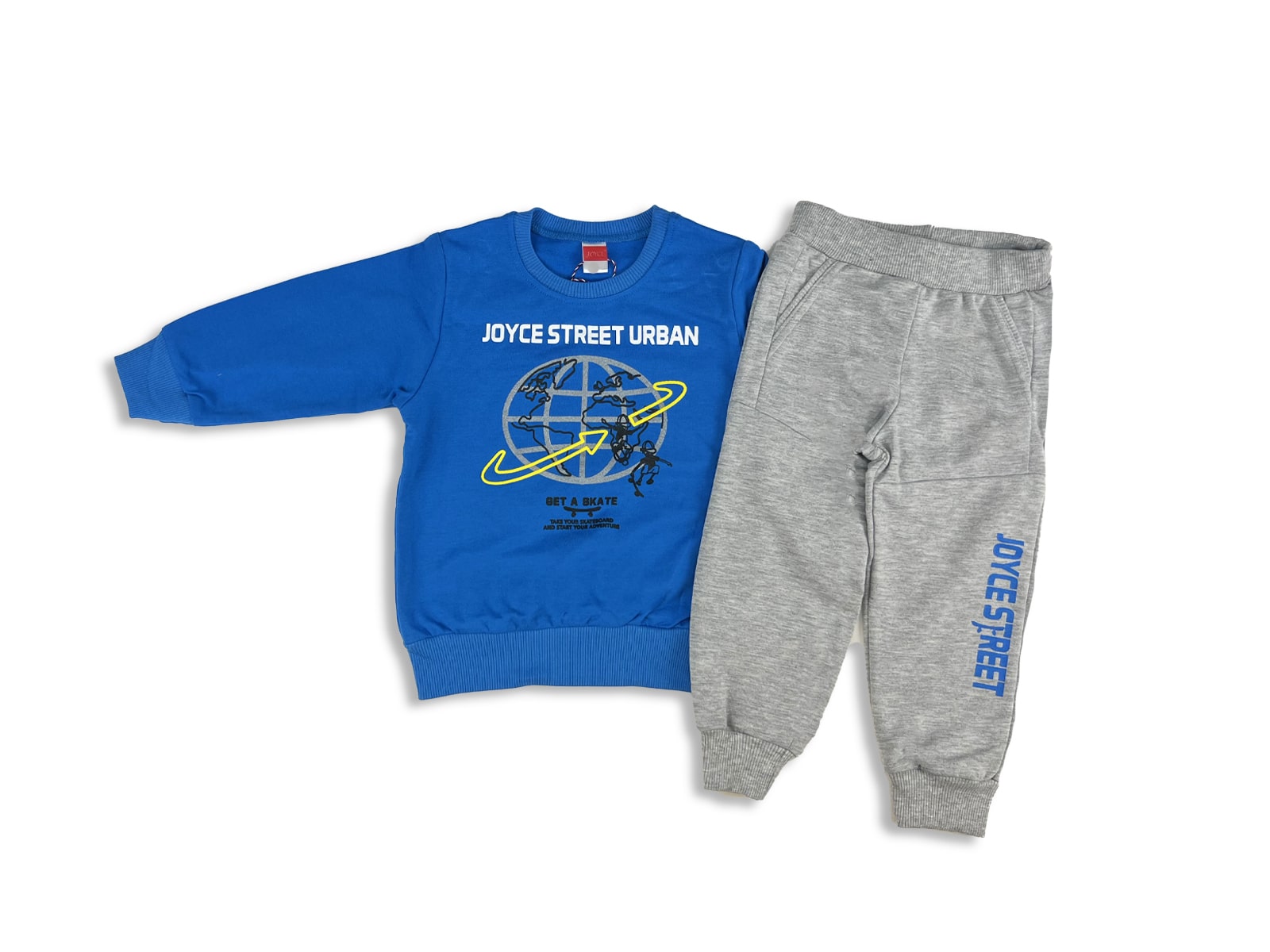 Το σετ αυτό είναι από την εταιρία Joyce και αποτελείται από μία μακρυμάνικη μπλουζίτσα και ένα μακρύ παντελονάκι. Η μπλούζα είναι σε μπλε χρώμα έχει σχέδιο παιδιά που κάνουν σκέιτμπορντ και γράφει “Street Urban”. Το παντελονάκι είναι σε γκρι χρώμα με λάστιχο περιμετρικά στη μέση.