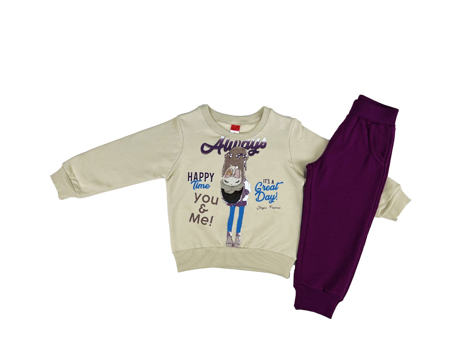 Το σετ αυτό είναι από την εταιρία Joyce και αποτελείται από μία μακρυμάνικη μπλουζίτσα και ένα μακρύ παντελονάκι. Η μπλούζα είναι σε μπεζ χρώμα με σχέδιο κοριτσάκι και 3D ( τρισδιάστατο ) λαγουδάκι όπου γράφει “It’s A great Day!”. Το παντελονάκι είναι σε μωβ χρώμα με λάστιχο περιμετρικά στη μέση και στους αστραγάλους.