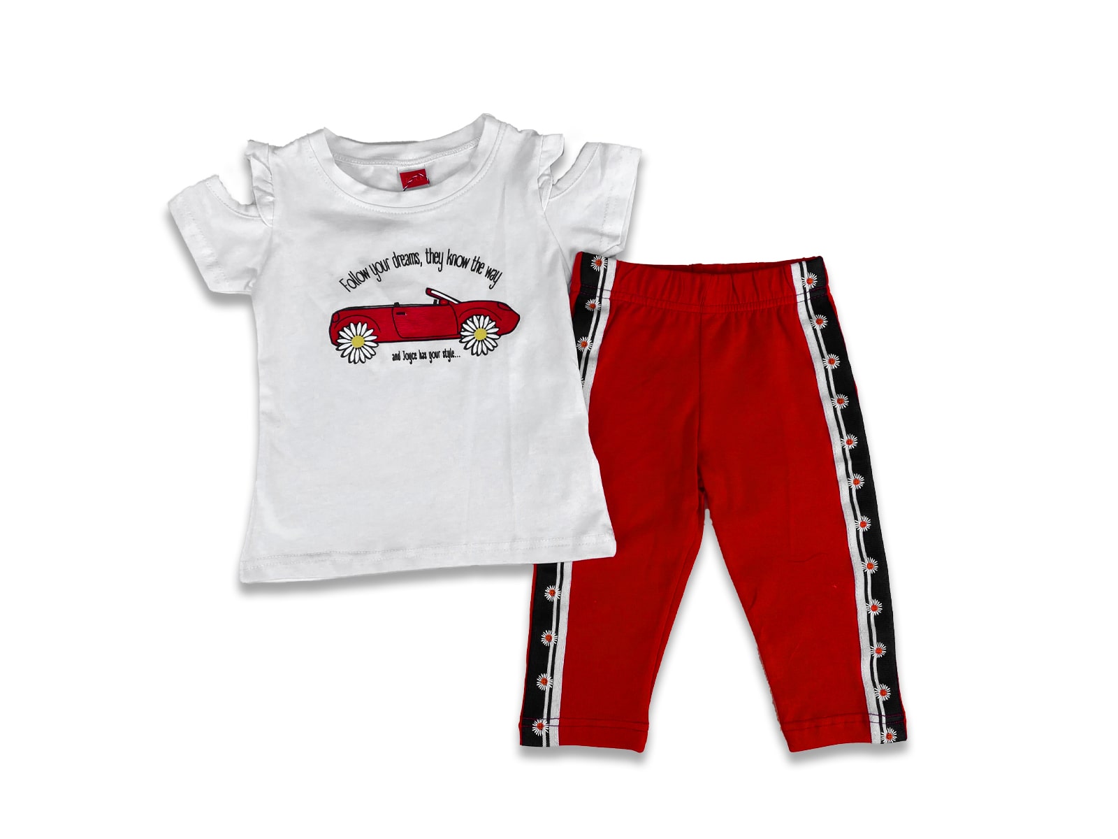 Το σετ αποτελείται από κοντομάνικη μπλουζίτσα με κόψιμο στον ώμο και παντελονάκι κολάν κάπρι. Η μπλουζίτσα είναι σε άσπρο χρώμα και έχει σχέδιο με αυτοκινητάκι με μαργαρίτες και γράφει “Follow your dreams”. Το παντελονάκι είναι κολάν κάπρι σε κόκκινο χρώμα, και έχει κατά μήκος μαργαρίτες. Επίσης το παντελονάκι έχει λάστιχο περιμετρικά στη μέση.