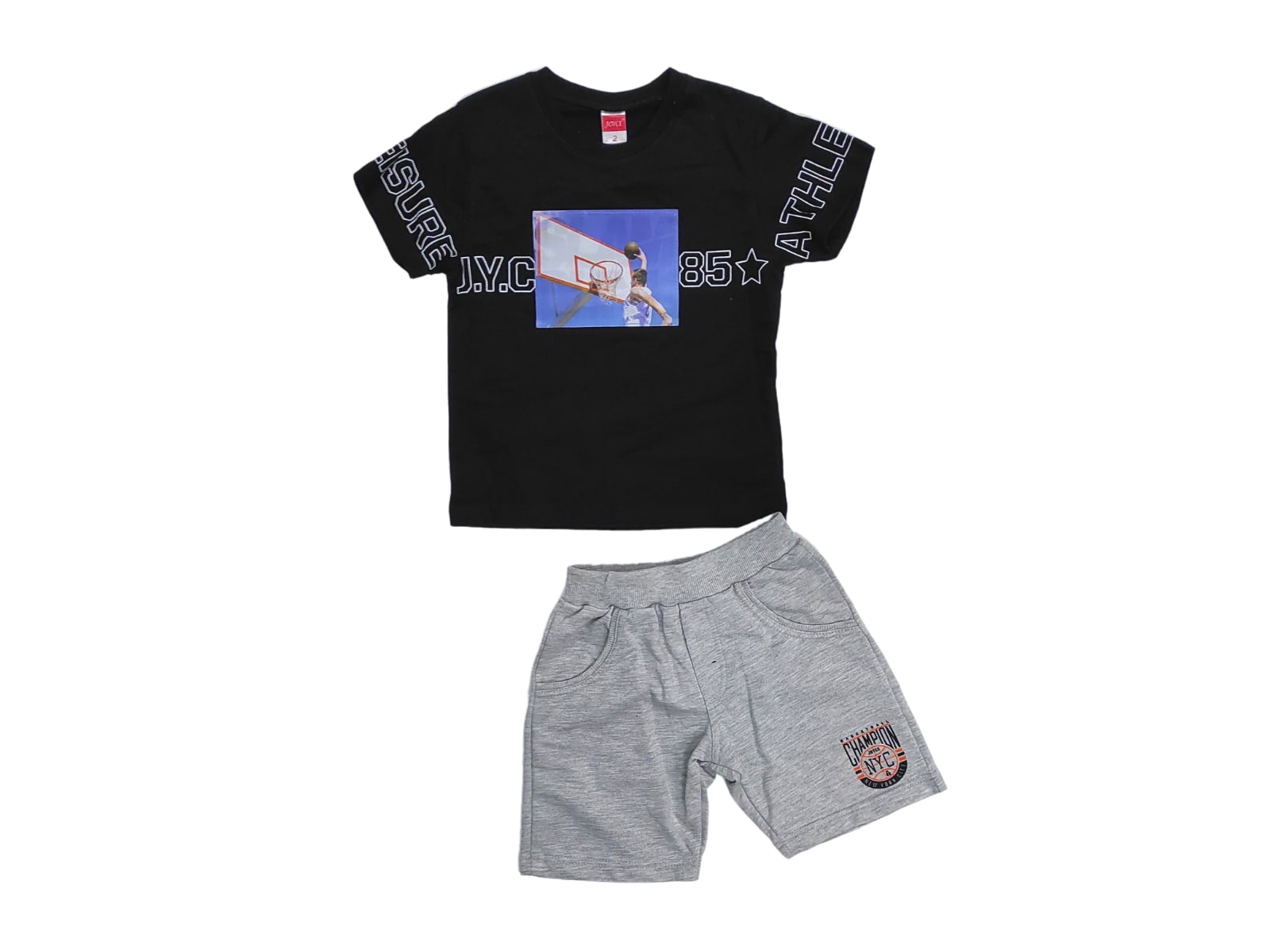 Το σετ αυτό αποτελείται από μία κοντομάνικη μπλουζίτσα και ένα παντελονάκι σορτσάκι. Η μπλουζίτσα είναι σε μαύρο χρώμα και έχει 3D απλικέ σχέδιο που εναλλάσσεται και γράφει “Slam Dunk”. Το σορτσάκι είναι σε γκρι χρώμα που γράφει “Champion Nyc” και έχει λάστιχο περιμετρικά στη μέση.