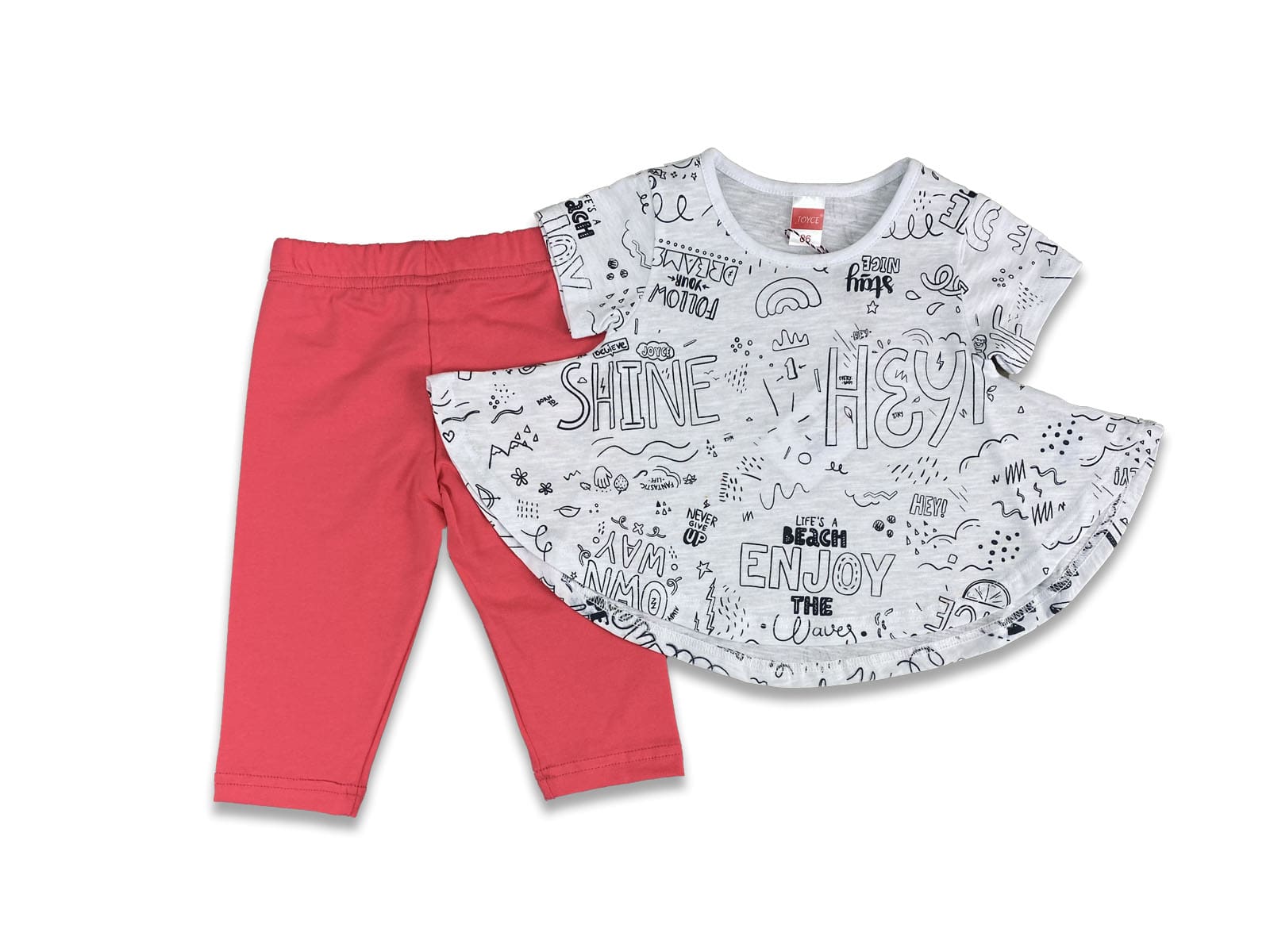 Το σετ αποτελείται από κοντομάνικη μπλουζίτσα και παντελονάκι κολάν κάπρι. Η μπλουζίτσα είναι σε άσπρο χρώμα σε γραμμή Α και γράφει “Hey Sunshine Enjoy The Waves”. Το παντελονάκι είναι σε κοραλί χρώμα. Επίσης έχει λάστιχο περιμετρικά στη μέση.