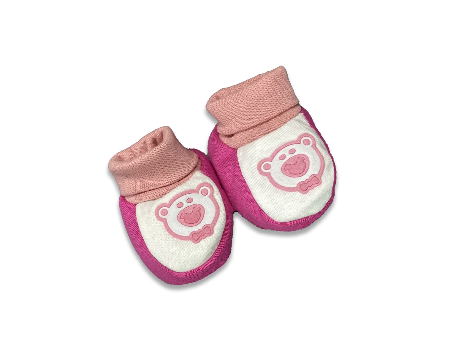 Καλτσοπάπουτσο αγκαλιάς με σχέδιο αρκουδάκι σε φούξια χρώμα. Είναι για νεογέννητο μωράκι.