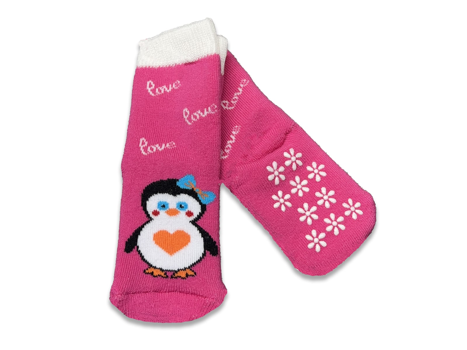 Καλτσούλες βρεφικές χειμωνιάτικες και αντιολισθητικές σε φούξια χρώμα με σχέδιο πιγκουίνο. Ενδέχεται τα χρώματα να διαφοροποιούνται ελάχιστα με αυτά της φωτογραφίας.