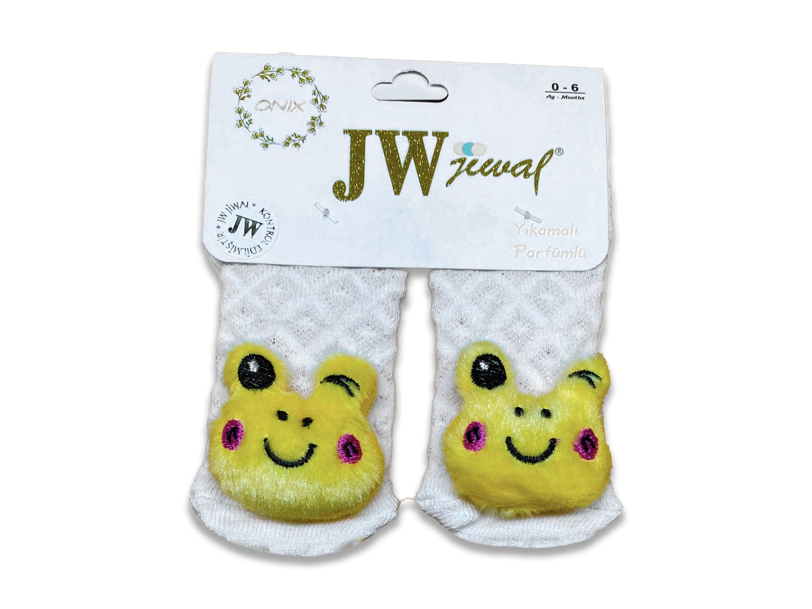 Καλτσούλες βρεφικές με τρισδιάστατο σχεδιάκι βατραχάκι που κλείνει το μάτι σε κίτρινο χρώμα. Κατάληλες για ηλικίες από 0 έως 6 μηνών.
