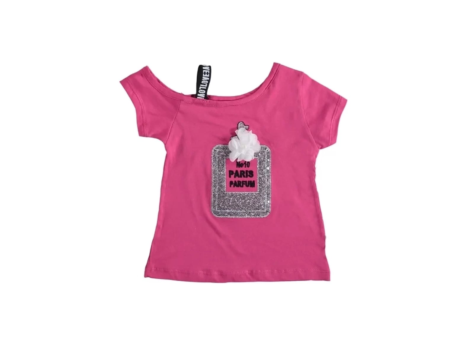 Η μπλουζίτσα είναι κοντομάνικη σε φούξια χρώμα με σχέδιο πούλιες, έχει κολλημένο λουλουδάκι και με απλικέ που γράφει “No10 Paris Parfum”.