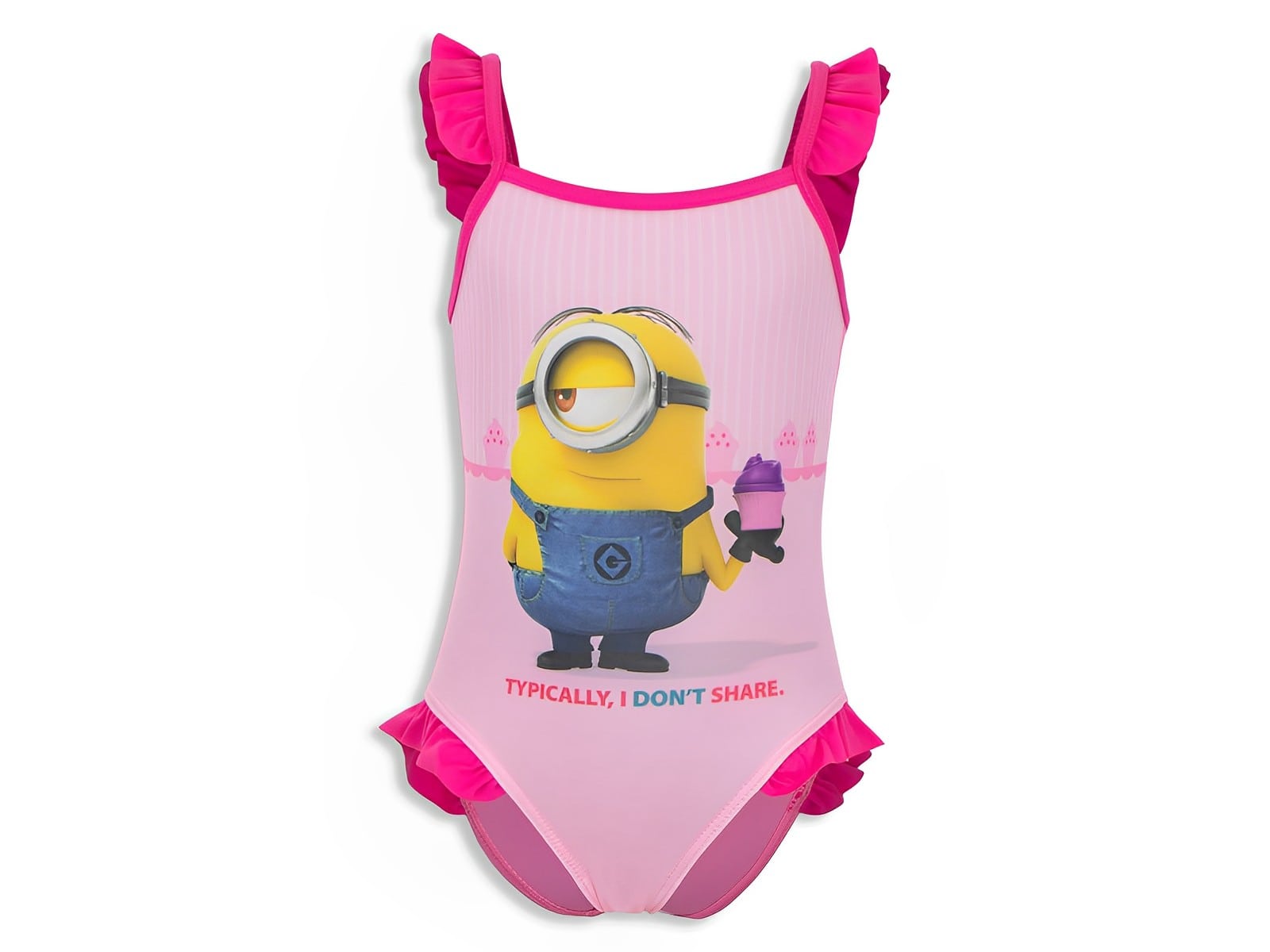 Το μαγιό αυτό είναι oλόσωμο με βολάν στους ώμους και τα μπουτάκια με σχέδιο Μίνιονς (Minnions) σε ροζ χρώμα. Είναι ιδανικό για την παραλία, την πισίνα αλλά και για το κολυμβητήριο.