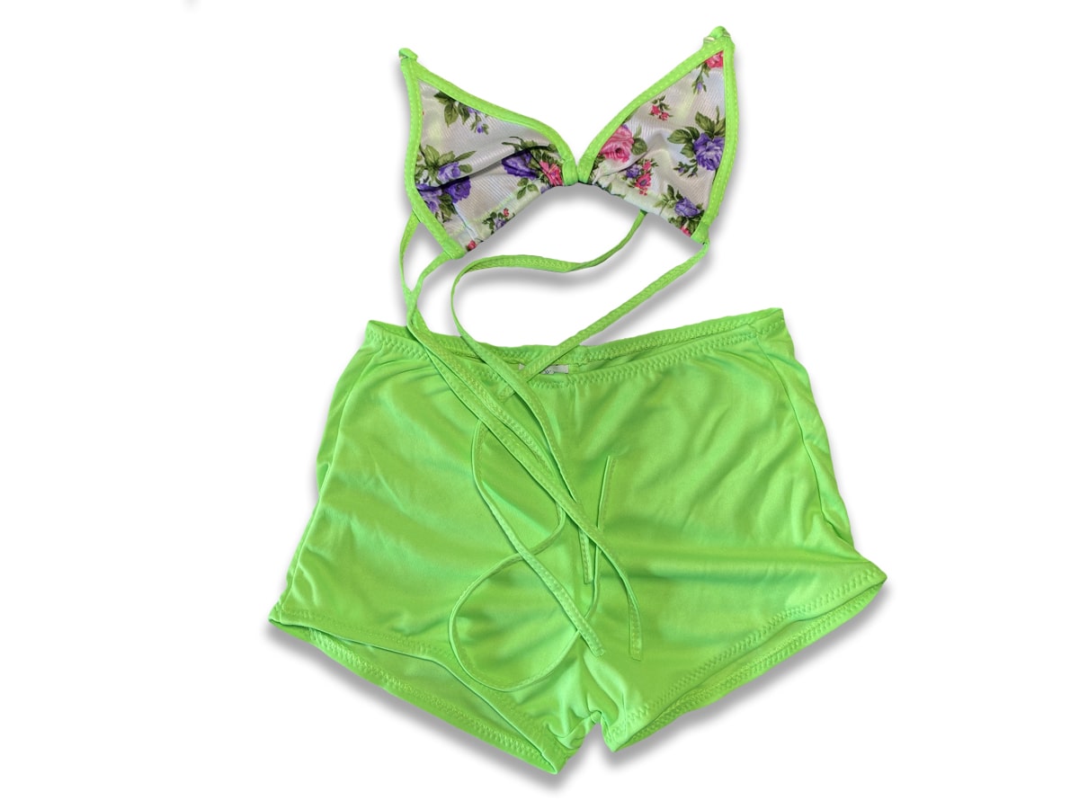 Το μαγιό αυτό αποτελείται από ένα σορτσάκι και ένα σουτιέν με σχέδιο λουλουδάκια σε λαχανί χρώμα.