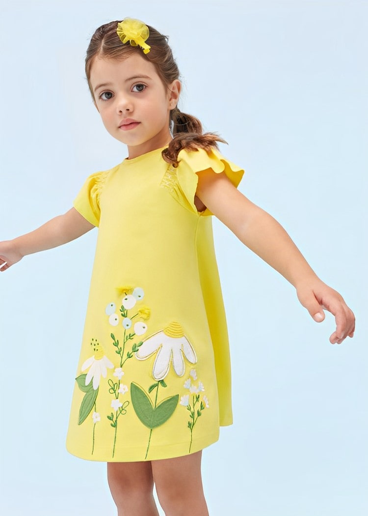 Κοριτσίστικο φορεματάκι από την εταιρία Mayoral σε κίτρινο χρώμα. Στα μανίκια του το φόρεμα έχει βολάν καθώς και το σχέδιό του είναι κεντητό. Έχει στρογγυλή λαιμόκοψη και το ύφασμά του είναι ελαστικό – βαμβακερό που προσφέρει άνεση στην κίνηση. Είναι ιδανικό για να δώσει στυλ και άνεση στις καθημερινές βόλτες του κοριτσιού σας.