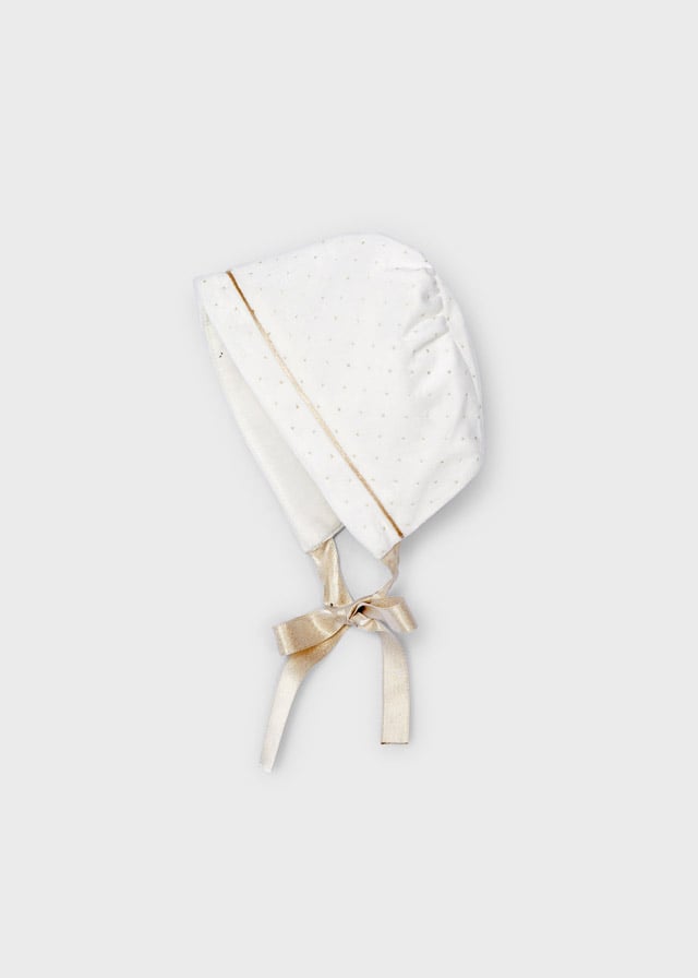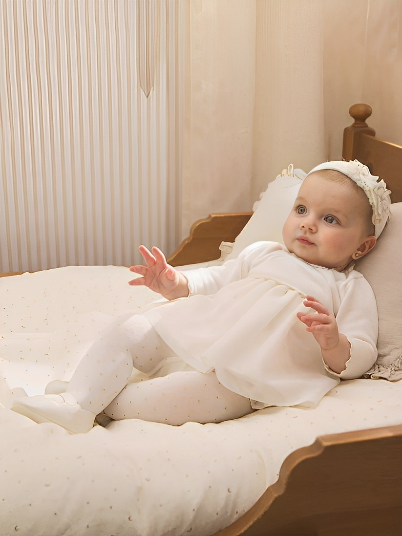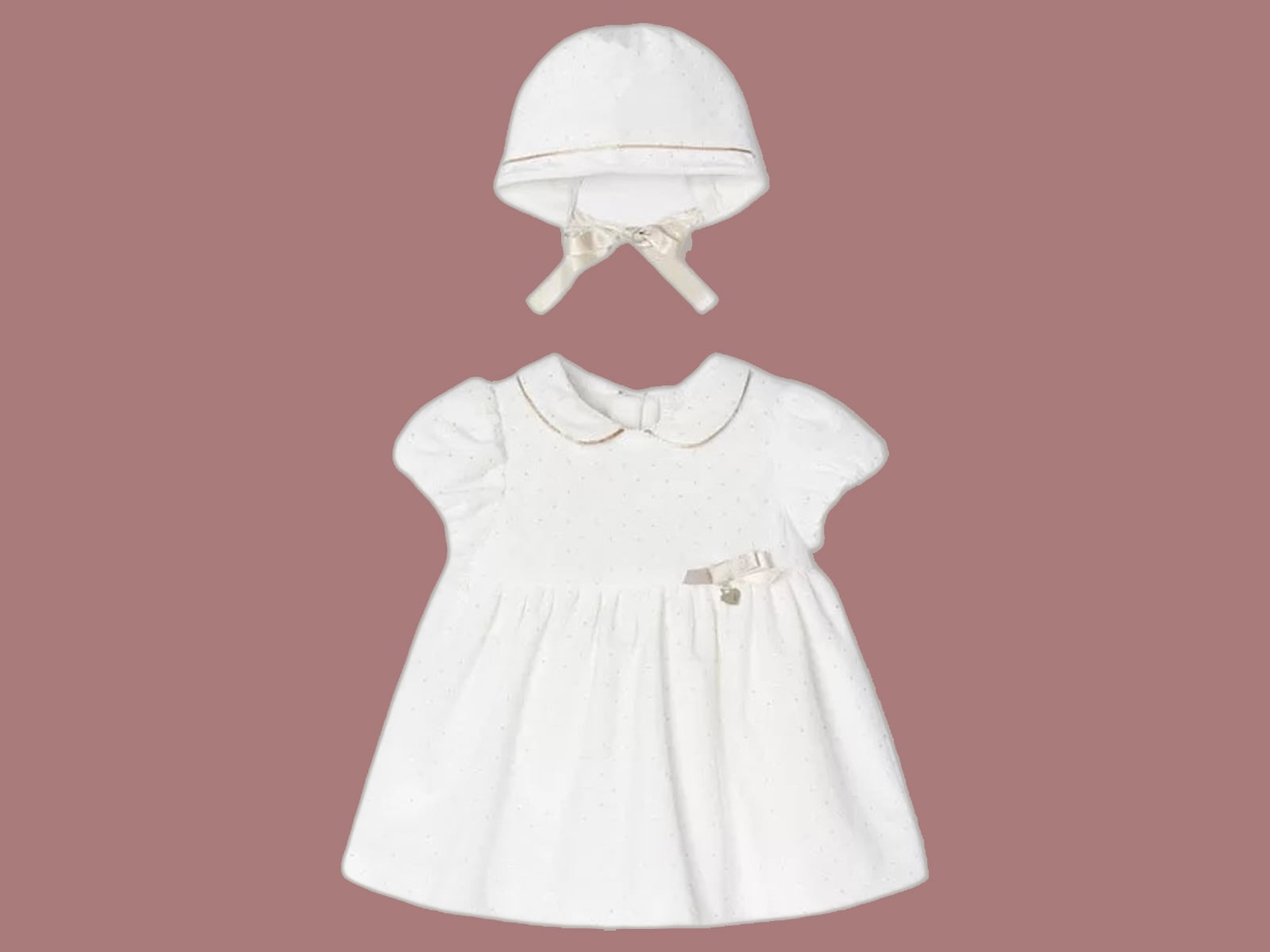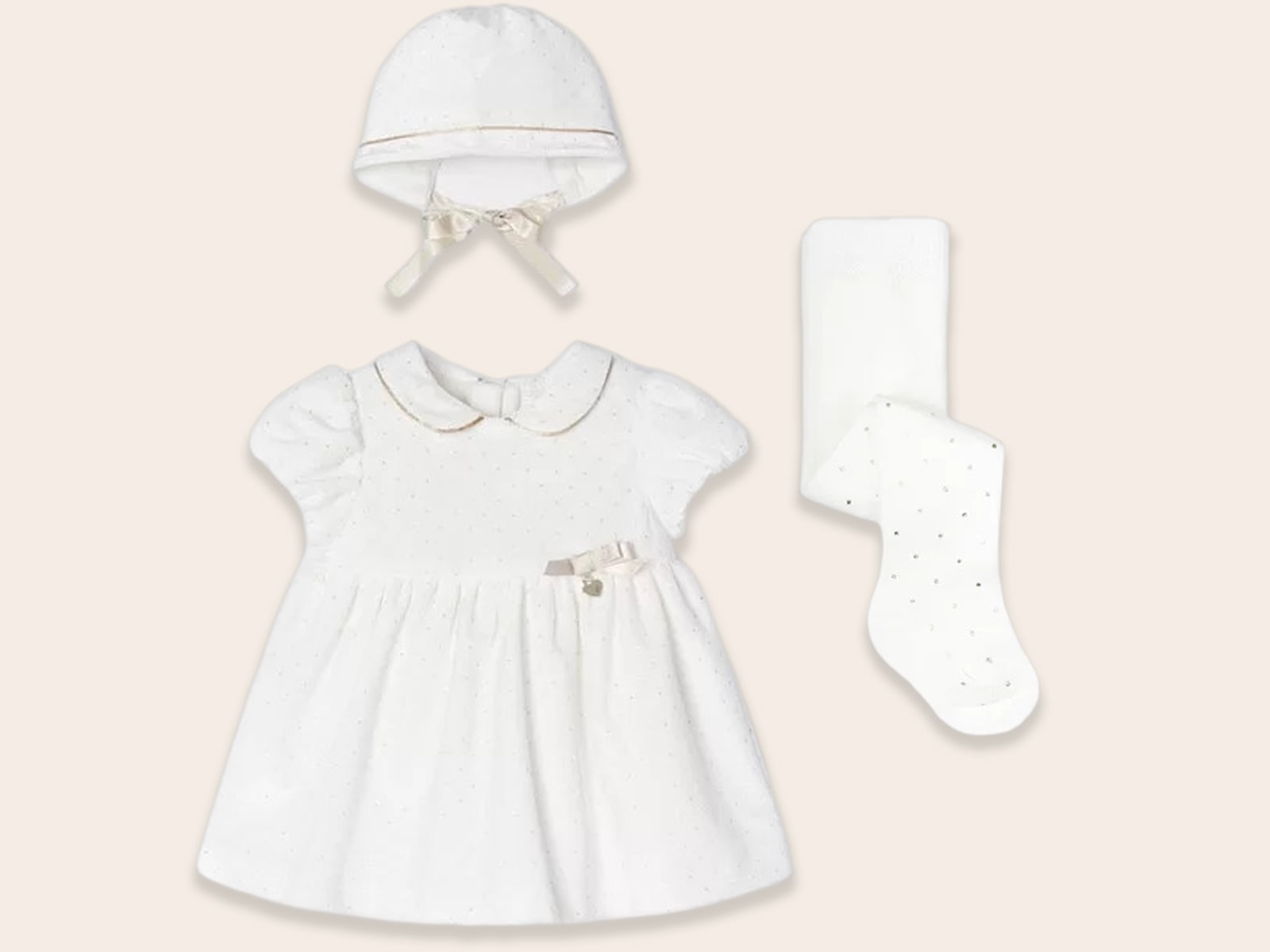 Το φορεματάκι είναι βελουτέ κοντομάνικο από την εταιρία Mayoral και συνοδεύετε με σκούφο για το κεφαλάκι του κοριτσιού και καλτσόν. Το φορεματάκι έχει Rex γιακά, επένδυση με τούλι και άνοιγμα με φερμουάρ στο πίσω μέρος του. Είναι σε λευκό χρώμα με χρυσές πιτσιλιές σε όλο το μήκος του καθώς έχει και τρισδιάστατο (3D) φιογκάκι. Το σκουφάκι έχει και αυτό χρυσές πιτσιλιές και έχει δέσιμο με κορδελάκι. Το καλτσόν είναι λευκό πουά από ελαστικό βαμβακερό ύφασμα άριστης ποιότητας με λάστιχο στην μέση για καλύτερη εφαρμογή. Το συγκεκριμένο σύνολο είναι ιδανικό για να απογειώσει το στυλ του κοριτσιού σας στις επίσημες εμφανίσεις του!