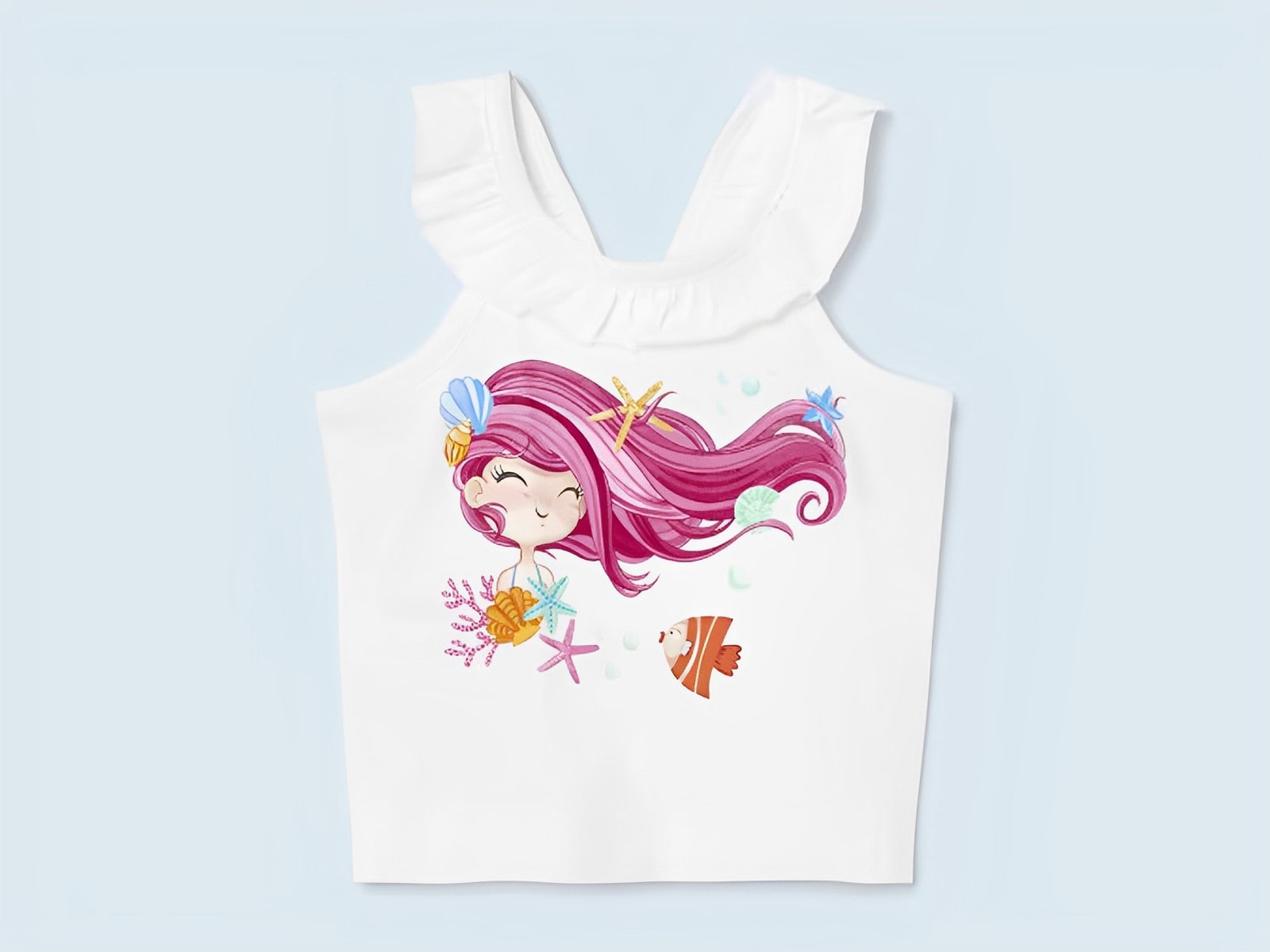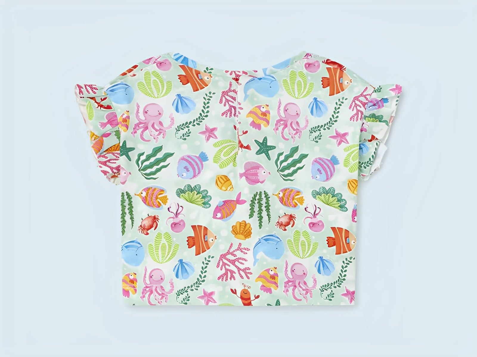 Σετάκι τριών τεμαχίων από την εταιρία Mayoral που αποτελείται από δύο μπλουζάκια και παντελονάκι σορτς. Η πρώτη μπλούζα είναι αμάνικη σε άσπρο χρώμα με σχέδιο γοργόνα και ψαράκια και έχει βολάν στην λαιμόκοψη. Η δεύτερη μπλούζα είναι κοντομάνικη με βολάν στα μανίκια σε βεραμάν χρώμα και έχει σχέδιο ψαράκια. Το σορτσάκι είναι σε φουξ χρώμα με λάστιχο περιμετρικά στην μέση για τέλεια εφαρμογή! Είναι ιδανικό για να απογειώσει το στυλ του κοριτσιού σας!