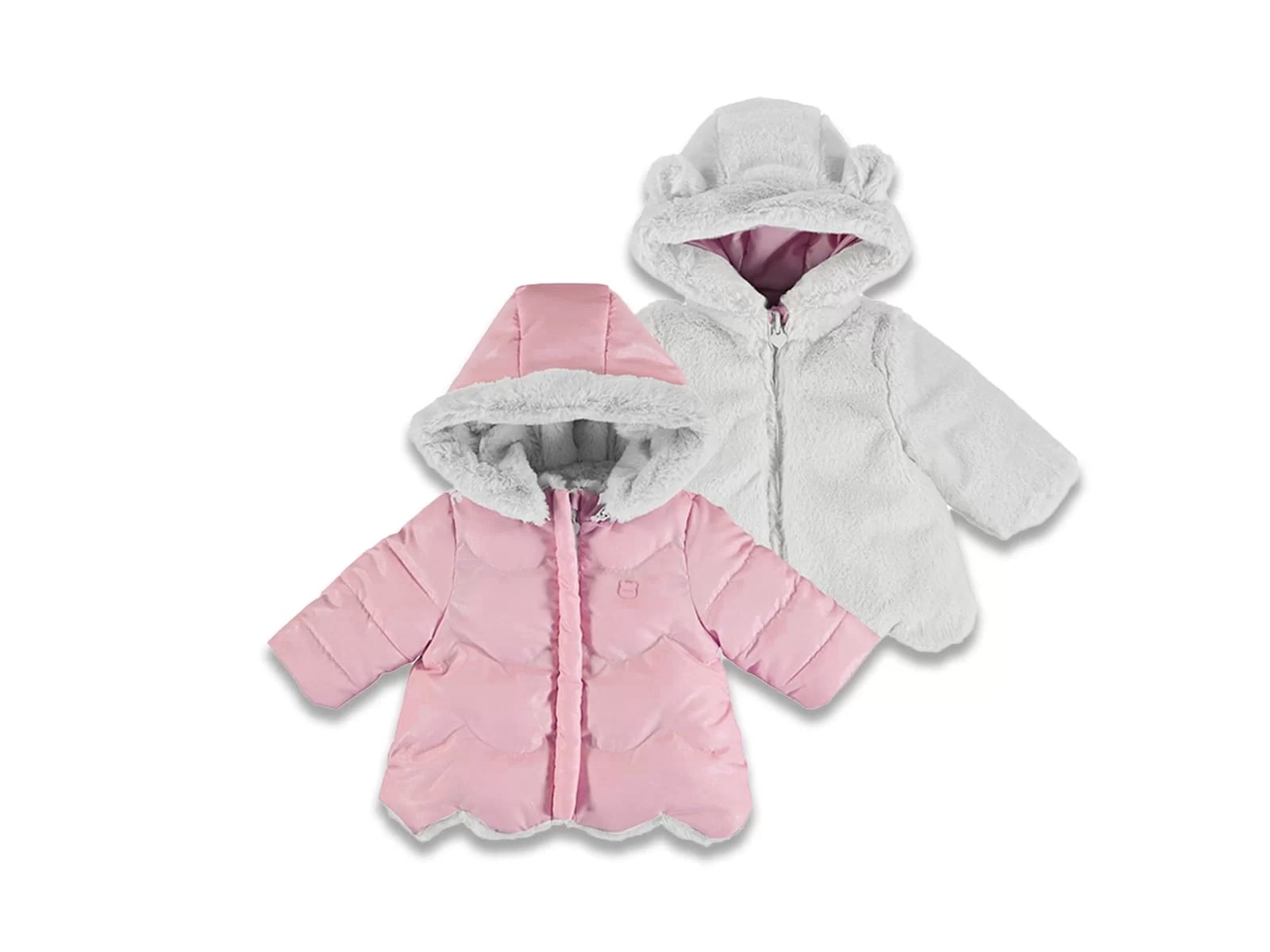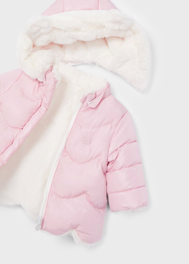 Κοριτσίστικο στραφταλιζέ μπουφανάκι από την εταιρία Mayoral το οποίο έχει κουκούλα και άνοιγμα με φερμουάρ. Διαθέτει ενισχυμένη επένδυση και η κουκούλα του έχει γούνα. Το μπουφάν έχει επίσης δύο τσεπούλες και είναι διπλής όψης ( double-fast) από την μία μερία είναι σε ροζ χρώμα ενώ από την άλλη είναι σε λευκό χρώμα με γούνινη υφή! Είναι ιδανικό για τις κρύες βόλτες!