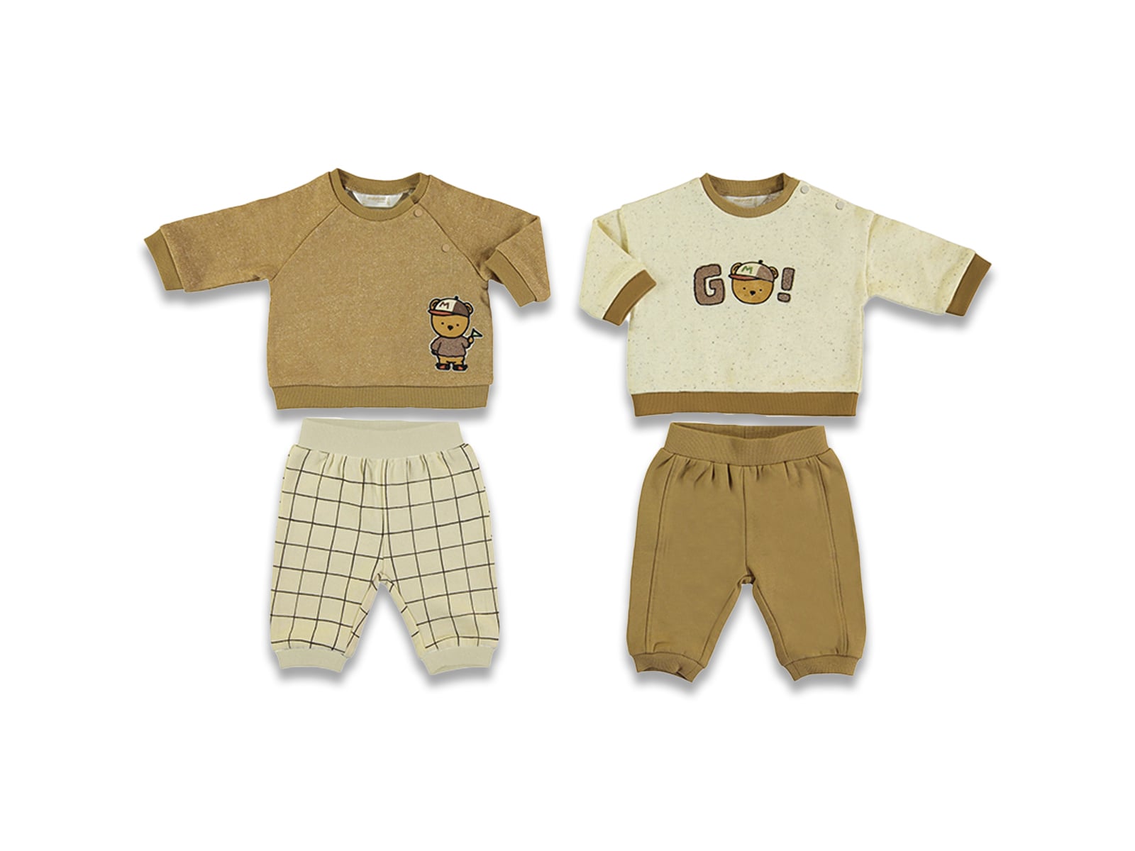 Δύο σετ 4 τεμαχίων από την εταιρία Mayoral τα οποία αποτελούνται από μπλουζίτσα και παντελονάκι. Το πρώτο σετάκι έχει καφέ μπλούζα και μπεζ παντελονάκι με σχέδιο καρό. Το δεύτερο σετάκι έχει μπεζ μπλούζα και καφέ παντελόνι. Και τα δύο σετάκια στην μπλούζα έχουν σχέδιο αρκουδάκι και άνοιγμα με τρούκς. Τα παντελόνια έχουν λάστιχο περιμετρικά στην μέση και στους αστραγάλους.