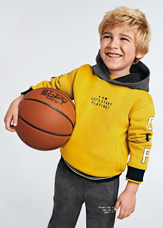 Το σετάκι αυτό είναι από την εταιρία Mayoral και αποτελείται από μία φούτερ μπλουζίτσα και 2 τεμάχια παντελονάκια τα οποία έχουν επένδυση από χνουδάκι. Η μπλούζα έχει κουκούλα και 2 τσεπούλες, είναι σε κίτρινο χρώμα και γράφει “Let’s Start Playing”. Το ένα παντελόνι είναι σε μαύρο χρώμα και το άλλο σε γκρι χρώμα. Και τα δύο παντελόνια έχουν τσέπες, λάστιχο περιμετρικά στην μέση και στους αστραγάλους καθώς και κορδόνια για τέλεια εφαρμογή!