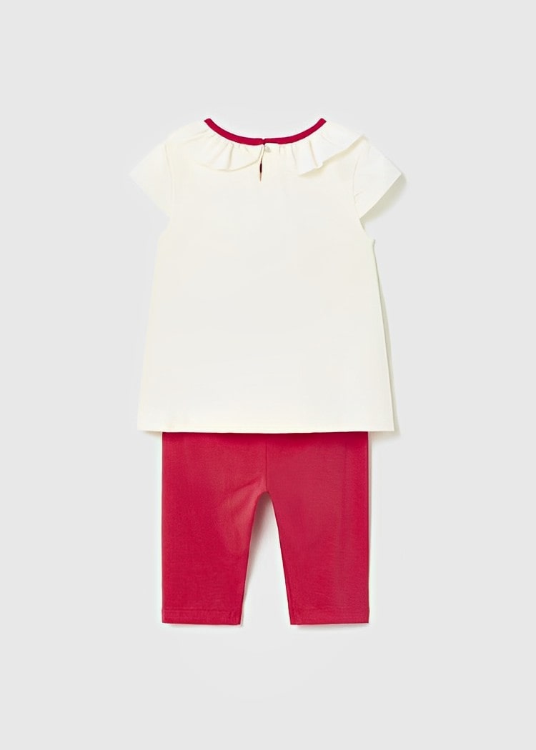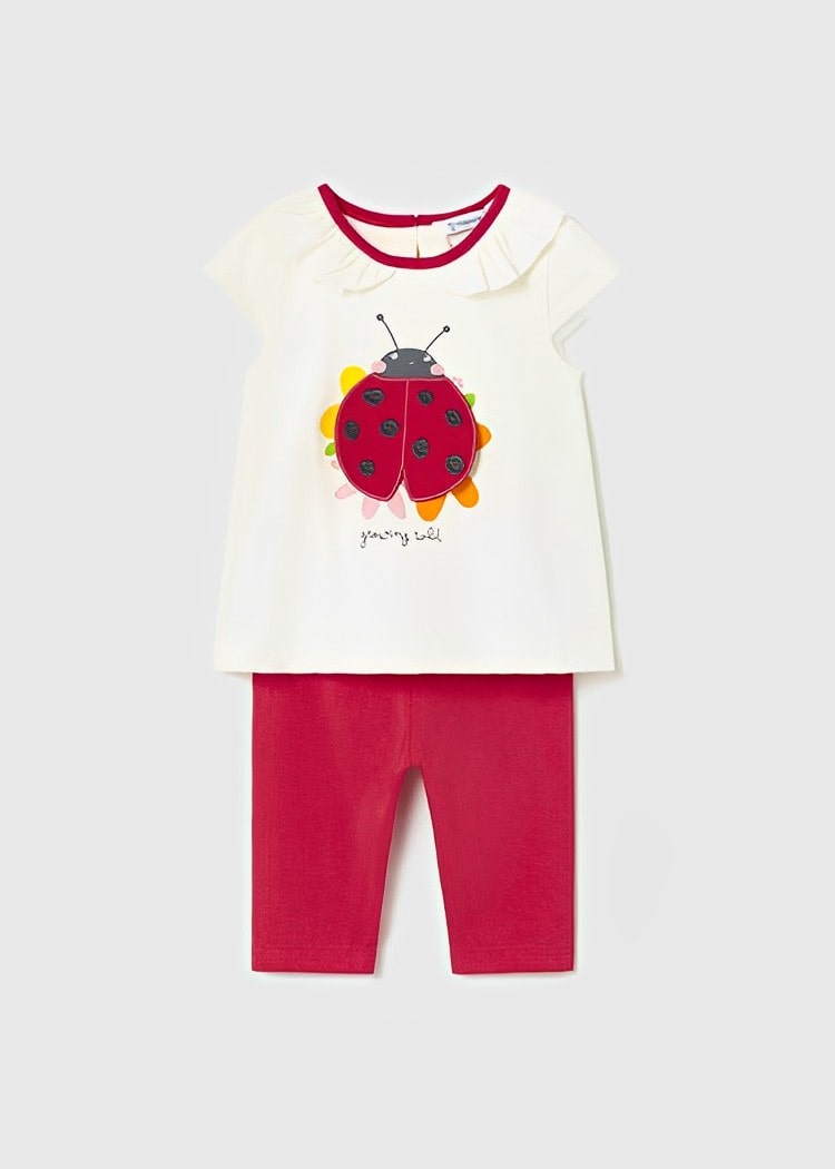 Καλοκαιρινό βρεφικό σετάκι από την εταιρία Mayoral με σχέδιο πασχαλίτσα τρισδιάστατη (3D). Η μπλουζίτσα είναι σε άσπρο χρώμα με βολάν στην λαιμόκοψη και μοντέρνο κόψιμο στα μανίκια. To παντελόνι είναι σε ροδί χρώμα με λάστιχο περιμετρικά στην μέση.