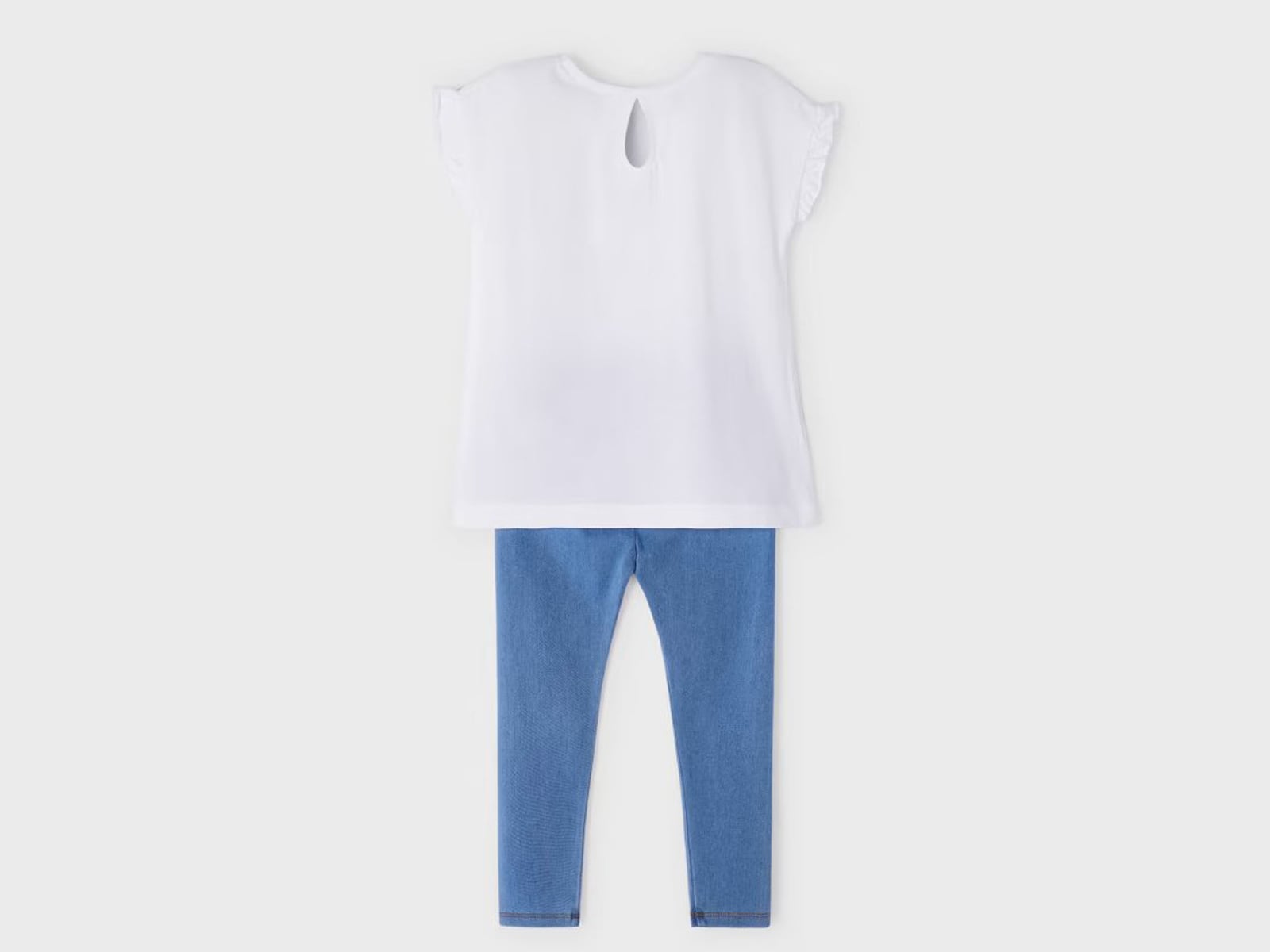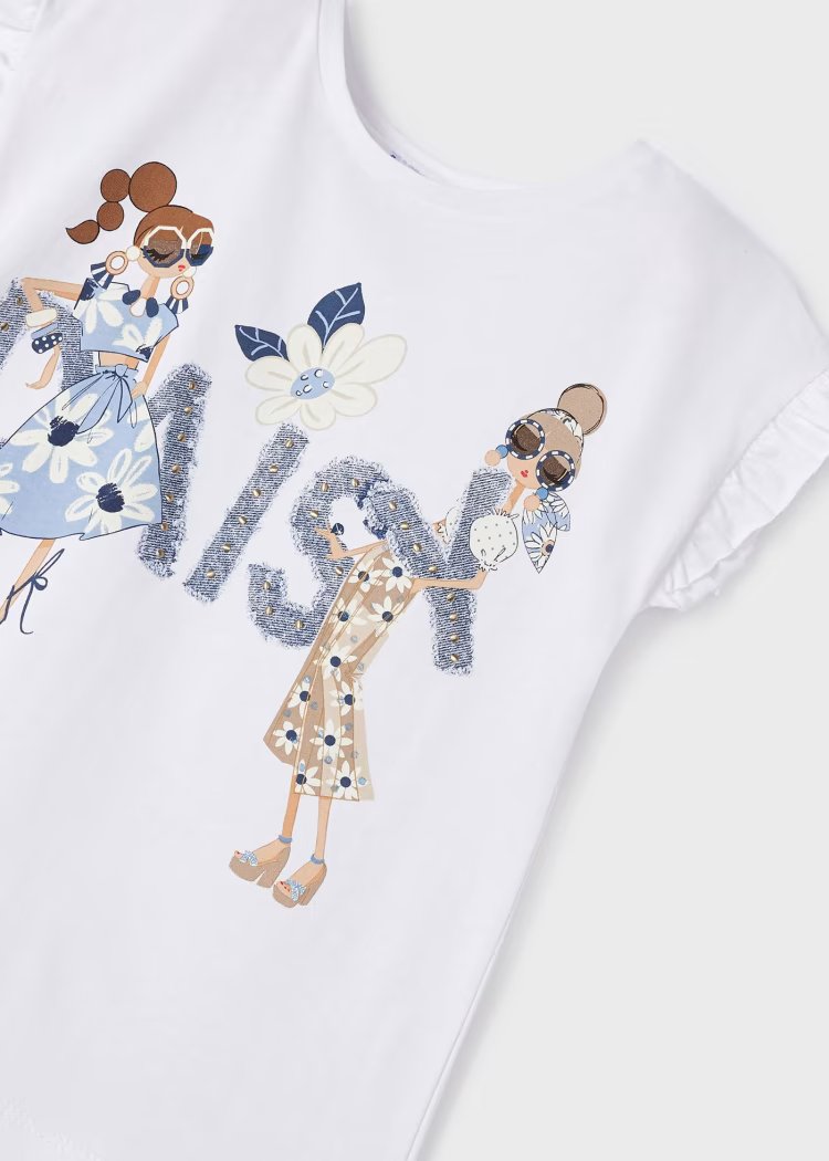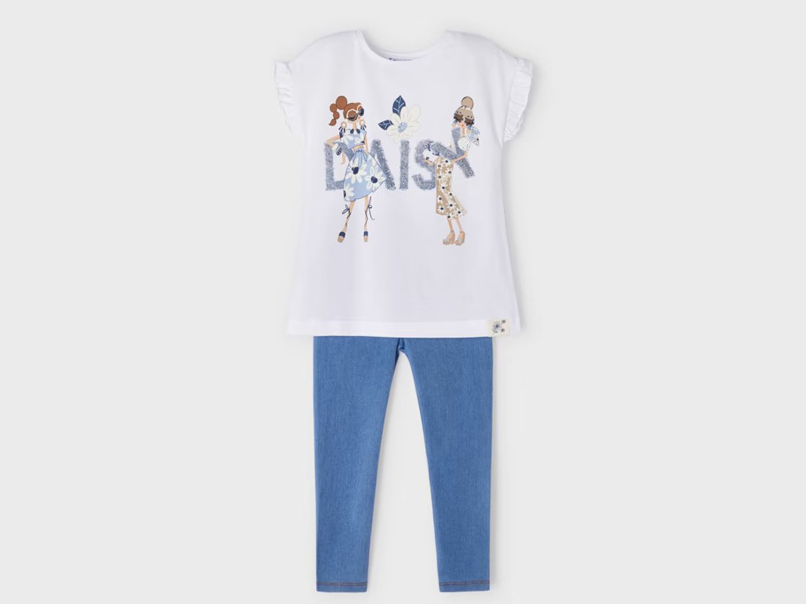 Σετ από την εταιρία Mayoral όπου αποτελείται από ένα κοντομάνικο μπλουζάκι και παντελόνι κολάν. Η μπλούζα είναι σε άσπρο χρώμα με βολάν στα μανίκια διακοσμημένη με τρουκς, έχει σχέδιο κοπέλες και γράφει “Daisy”. Το κολάν είναι σε μπλε χρώμα με λάστιχο περιμετρικά της μέσης για άψογη εφαρμογή. Είναι ιδανικό για να απογειώσει το στυλ του κοριτσιού σας!