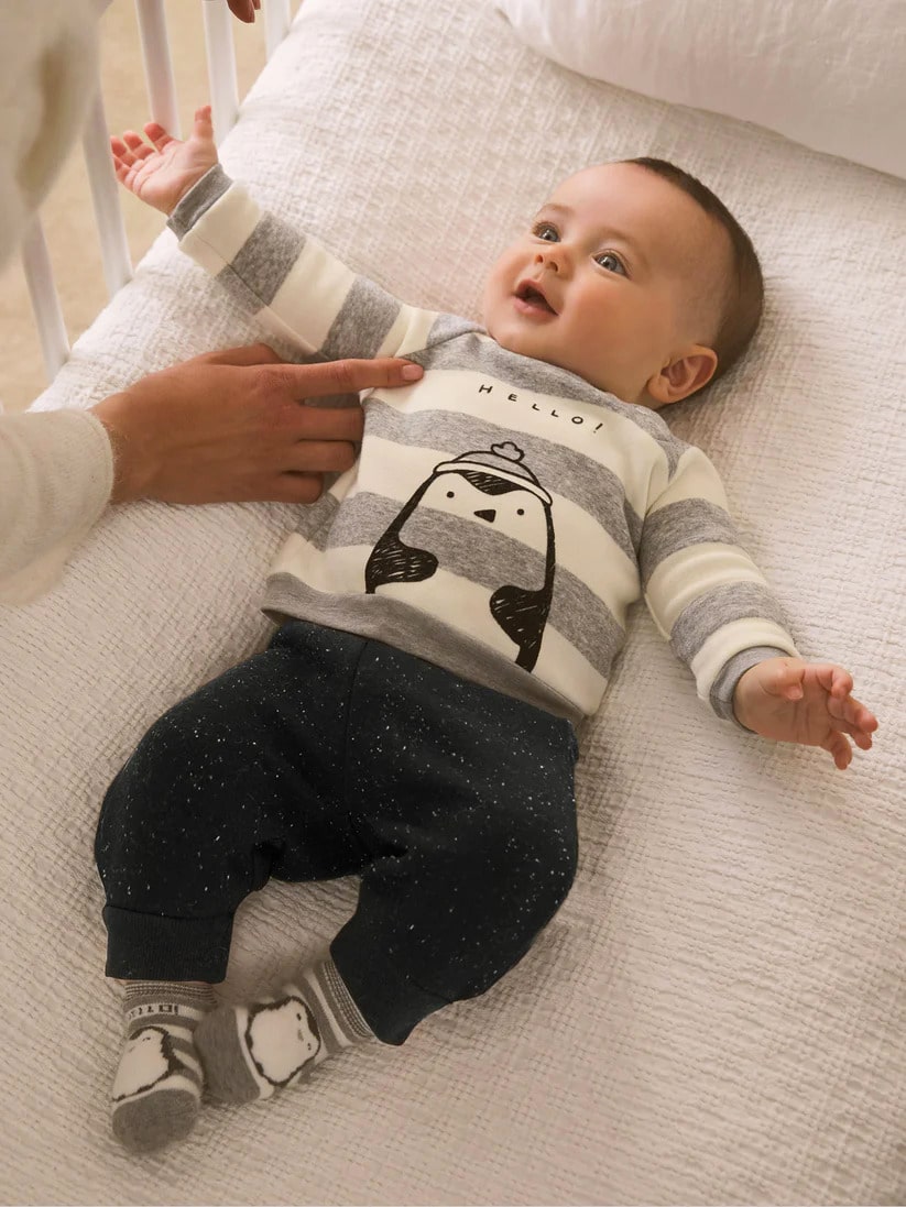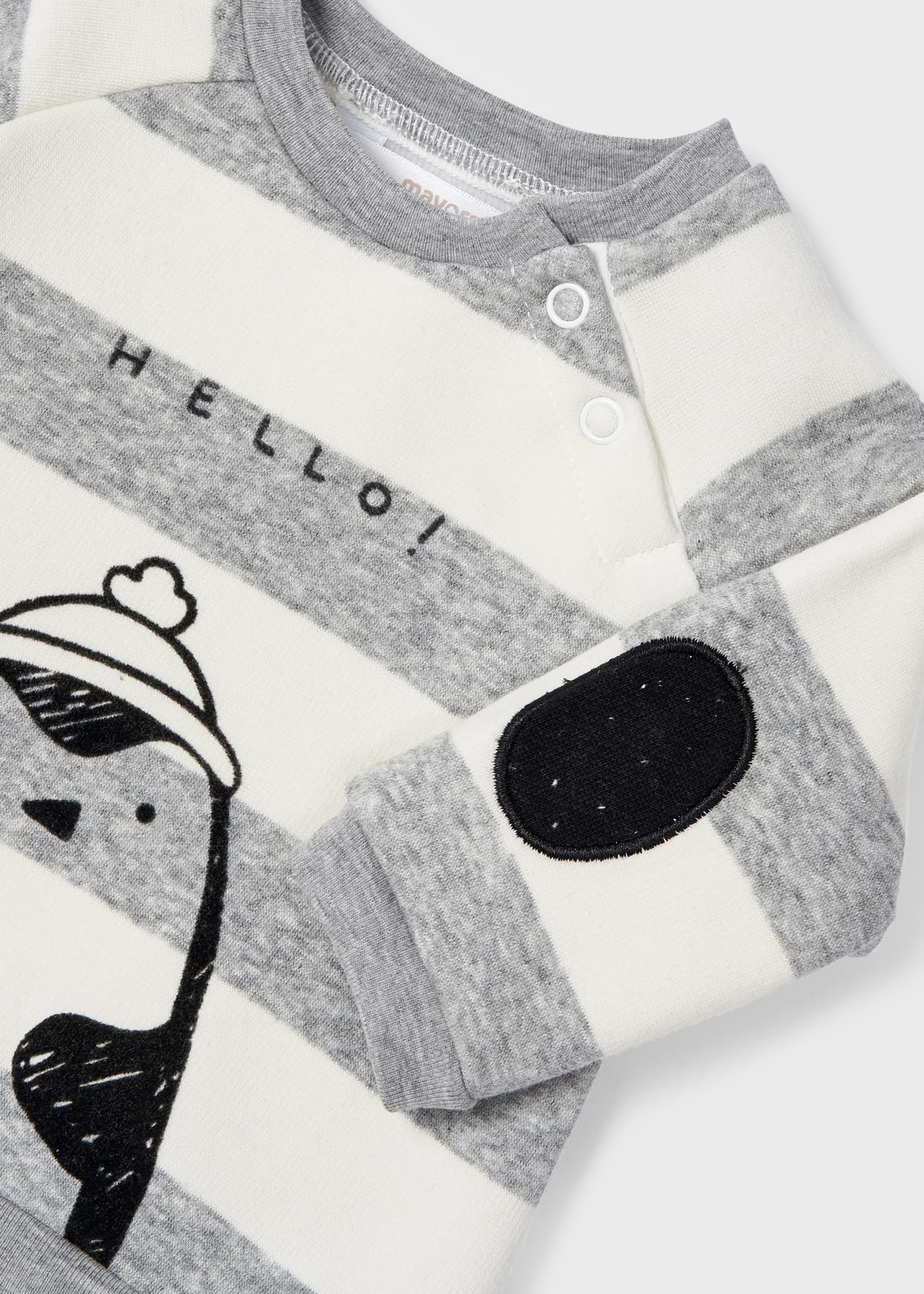 Το σετάκι αυτό είναι από την εταιρία Mayoral και αποτελείται από μία μπλουζίτσα και ένα παντελονάκι τα οποία έχουν επένδυση με χνουδάκι. Η μπλούζα είναι σε άσπρο – γκρι χρώμα με σχέδιο στάμπα πιγκουίνο και γράφει “Hello!”. Το παντελόνι είναι σε μαύρο χρώμα με άσπρες λεπτομέρειες και έχει λάστιχο περιμετρικά στην μέση και στους αστραγάλους καθώς και κορδονάκι για τέλεια εφαρμογή!