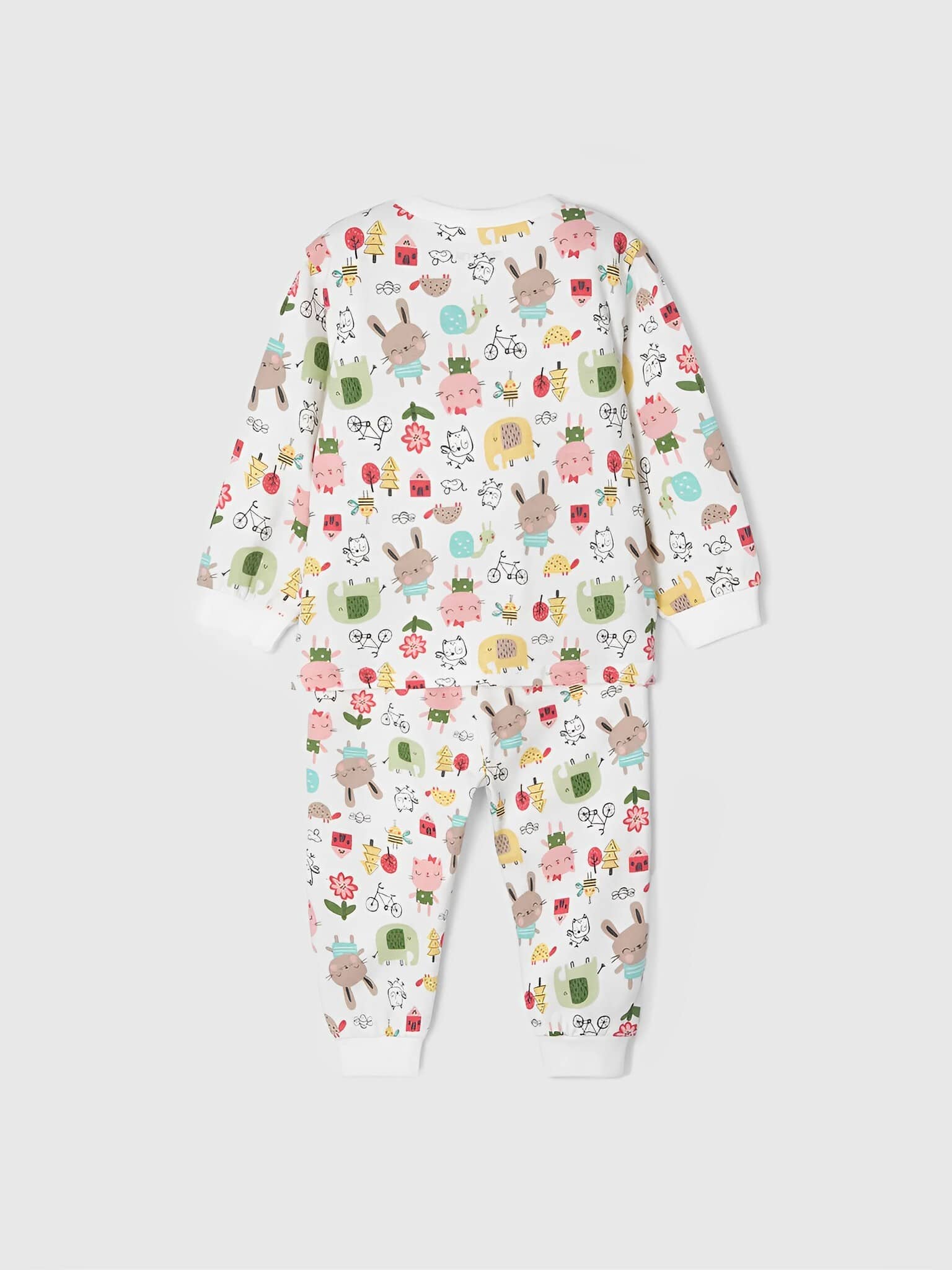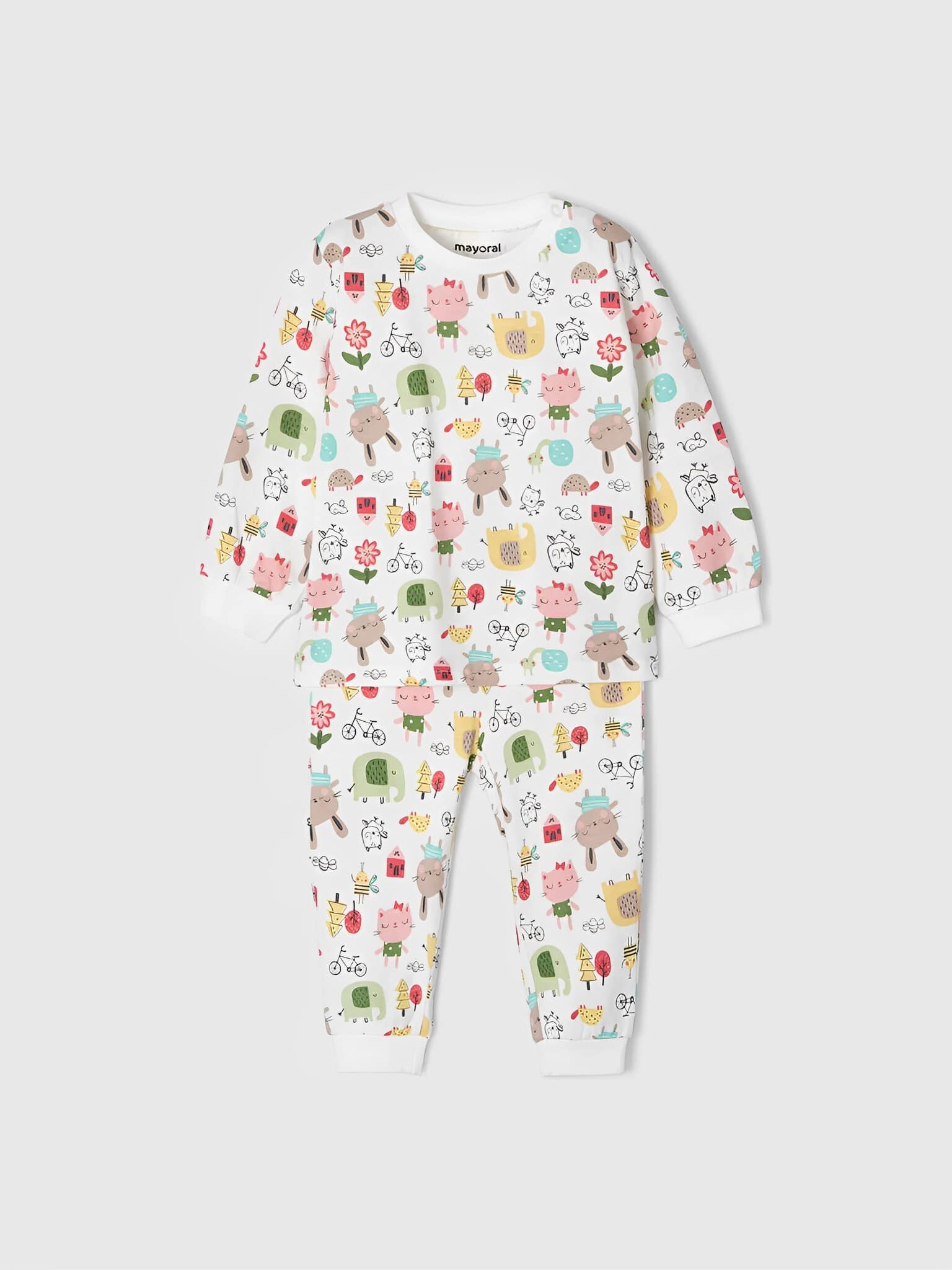 Το βρεφικό πιτζαμάκι αυτό είναι από την εταιρία Mayoral και αποτελείται από μία μπλουζίτσα και ένα παντελονάκι μακό. Η μπλούζα είναι σε άσπρο χρώμα με σχέδιο με στάμπα διάφορα ζωάκια. Έχει στρογγυλή λαιμόκοψη και κουμπάκι στο ύψος του ώμου για μεγαλύτερη ευκολία. Το παντελόνι είναι στο ίδιο σχέδιο όπως και η μπλούζα, έχει λάστιχο περιμετρικά στην μέση και στους αστραγάλους για τέλεια εφαρμογή! Είναι κατάλληλο για αποφυγή αλλεργίων, με μεγάλη αντοχή στον χρόνο. Μπορεί να φορεθεί κι εκτός ύπνου, μέσα στο σπίτι, χωρίς να χρειάζεται να ψάχνετε καθημερινά για ρούχα.