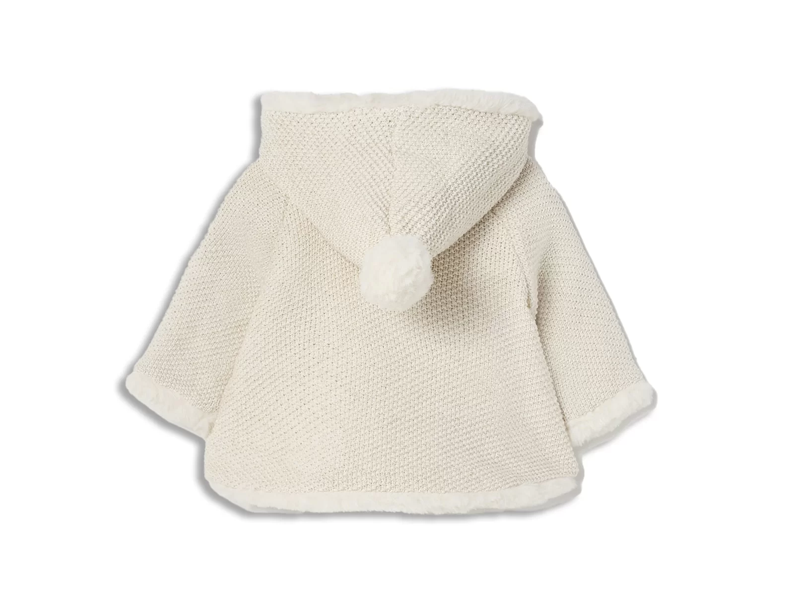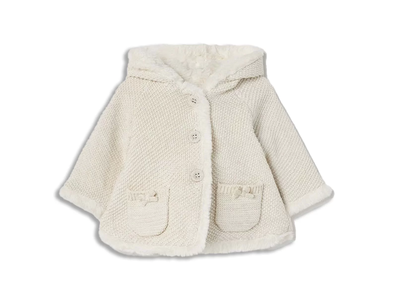 Πλεκτή γούνινη ζακετούλα με κουκούλα από την εταιρία Mayoral σε μπεζ χρώμα. Η ζακέτα είναι στραφταλιζέ, έχει δύο τσεπούλες με φιογκάκια και άνοιγμα με κουμπάκια. Έχει ενισχυμένη γούνινη επένδυση και στην κουκούλα έχει και φουντίτσα. Είναι ιδανικό για να απογειώσει το στυλ του κοριτσιού σας!