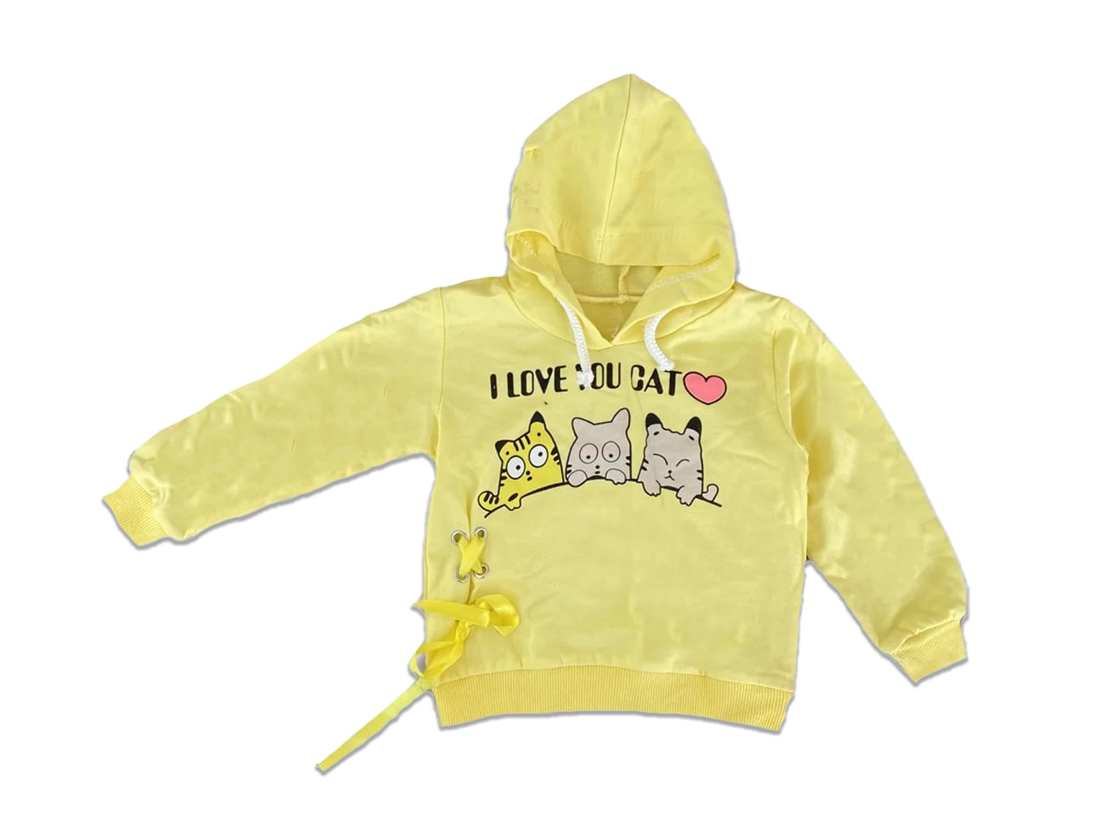 Η μπλουζίτσα αυτή είναι μακρυμάνικη σε κίτρινο χρώμα με κουκούλα και έχει σχέδιο γατούλες και γράφει “I Love You Cat”, επίσης έχει τρυπούλες με δέσιμο κορδέλα φιογκάκι στα πλάγια.
