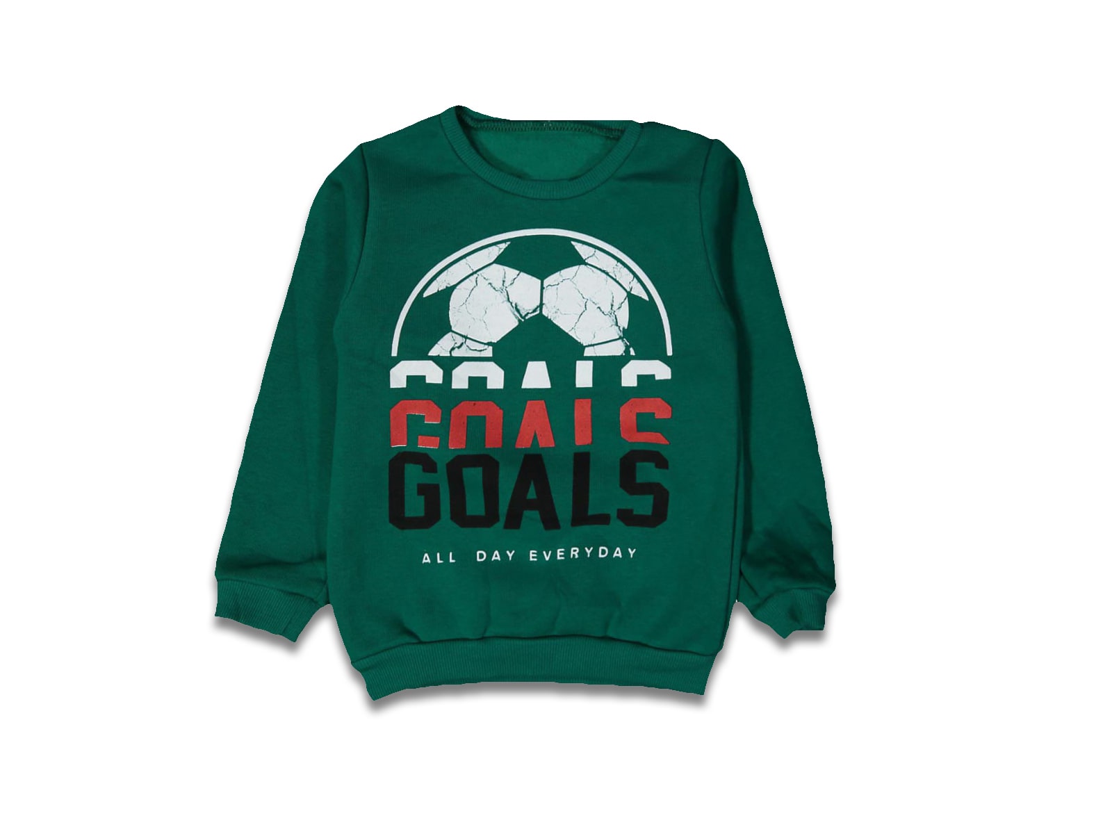 Η μπλούζα είναι από χοντρό φούτερ ύφασμα σε πράσινο χρώμα και έχει σχέδιο στάμπα όπου γράφει “Goal”.