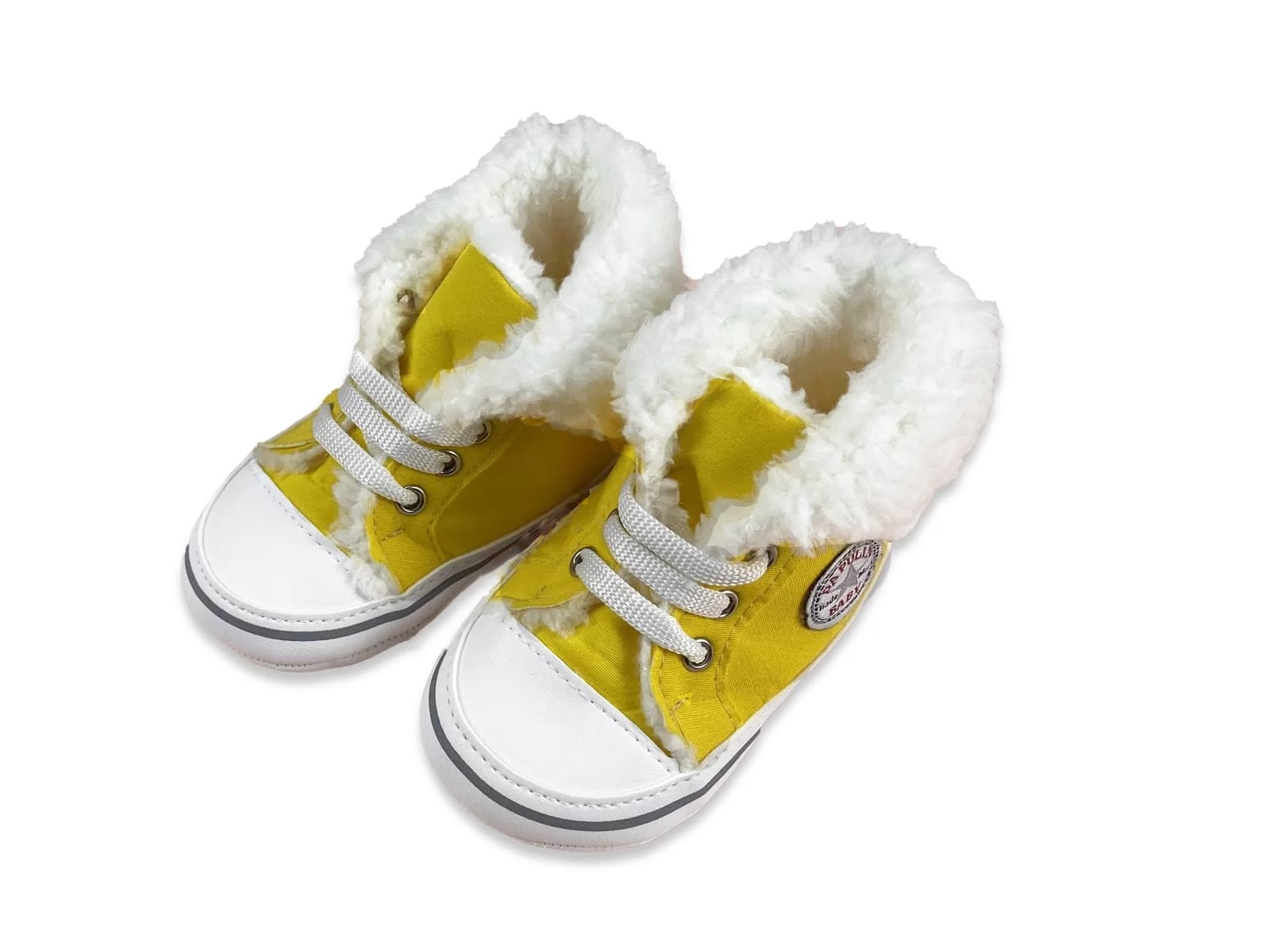 Μποτάκια αγκαλιάς με κορδονάκια και γούνινη επένδυση, σε κίτρινο χρώμα.