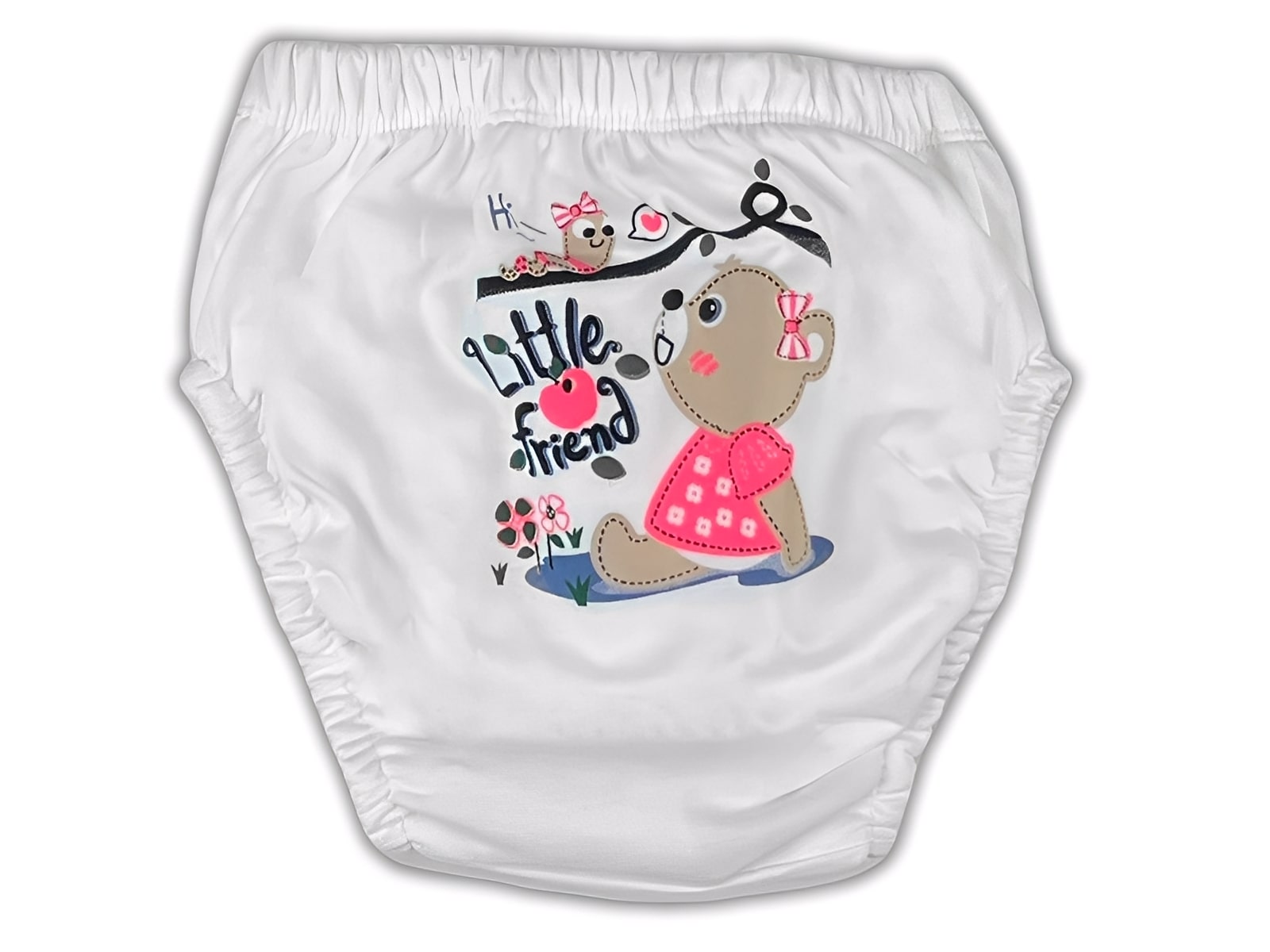 Αποχαιρετάμε τις πάνες! Με το συγκεκριμένο βρακάκι εκπαιδεύεται σιγά σιγά το βρεφάκι σας για την μετάβαση από την πάνα στην τουαλέτα. Χρησιμοποιούνται αντί για τα κοινά βρακάκια, τον πρώτο καιρό της εκπαίδευσης. Είναι άνετες και δροσερές, δεν πιέζουν το παιδί, προσφέροντας ελευθερία κινήσεων. Είναι σε λευκό χρώμα με σχέδιο ζωάκι αρκουδάκι και γράφει “Little Friend”.