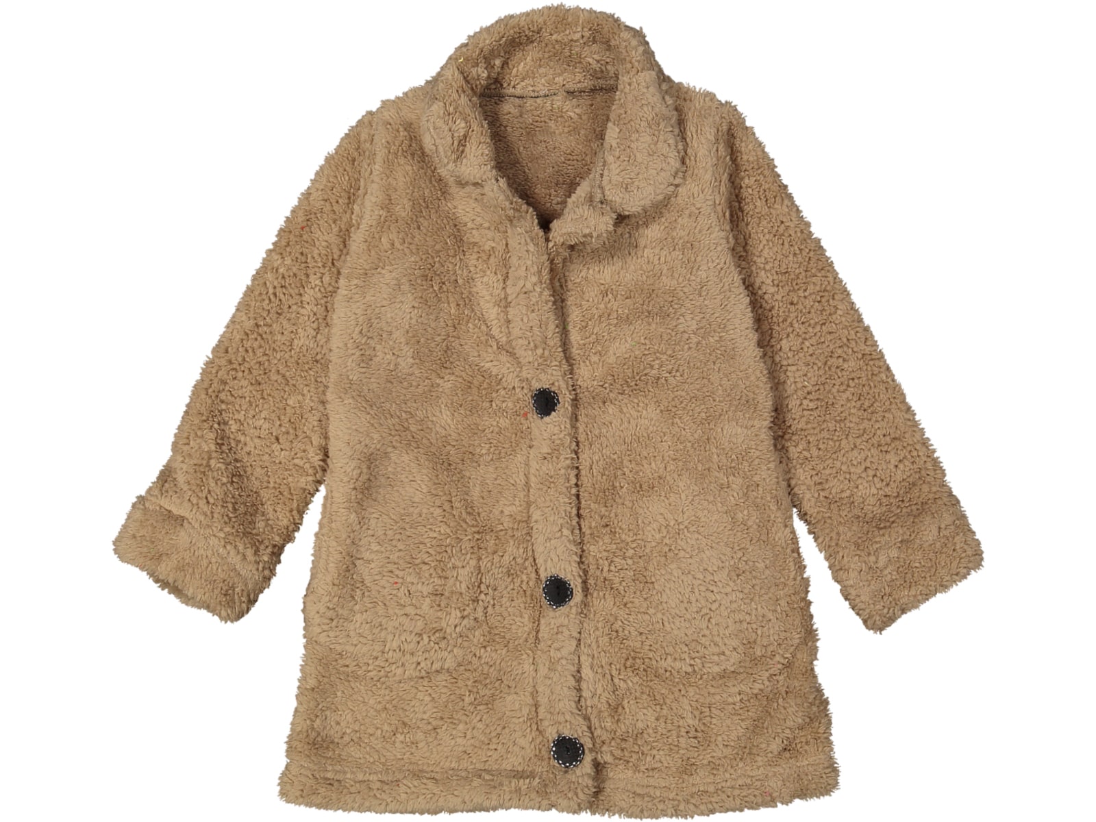 Παιδική ζακέτα fleece (φλις) με τσεπούλες σε καφέ ανοιχτό χρώμα. Είναι ανοιχτό στο λαιμό και έχει κλείσιμο με κουμπιά.