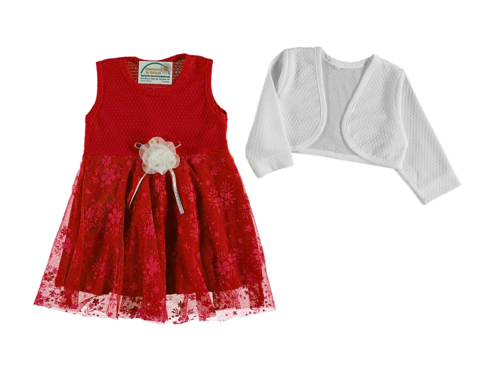 Παιδικό φορεματάκι αμάνικο το οποίο είναι συνδυασμένο με μακρυμάνικο ζακετάκι μπολερό. Το φόρεμα είναι σε κόκκινο χρώμα με τούλι και είναι διακοσμημένο με λουλουδάκια, ενώ εσωτερικά έχει και κόκκινη φόδρα. Το μπολερό είναι σε λευκό χρώμα. Είναι ιδανικό ώστε το κοριτσάκι σας να κλέψει τις εντυπώσεις σε κάθε επίσημη περίσταση!