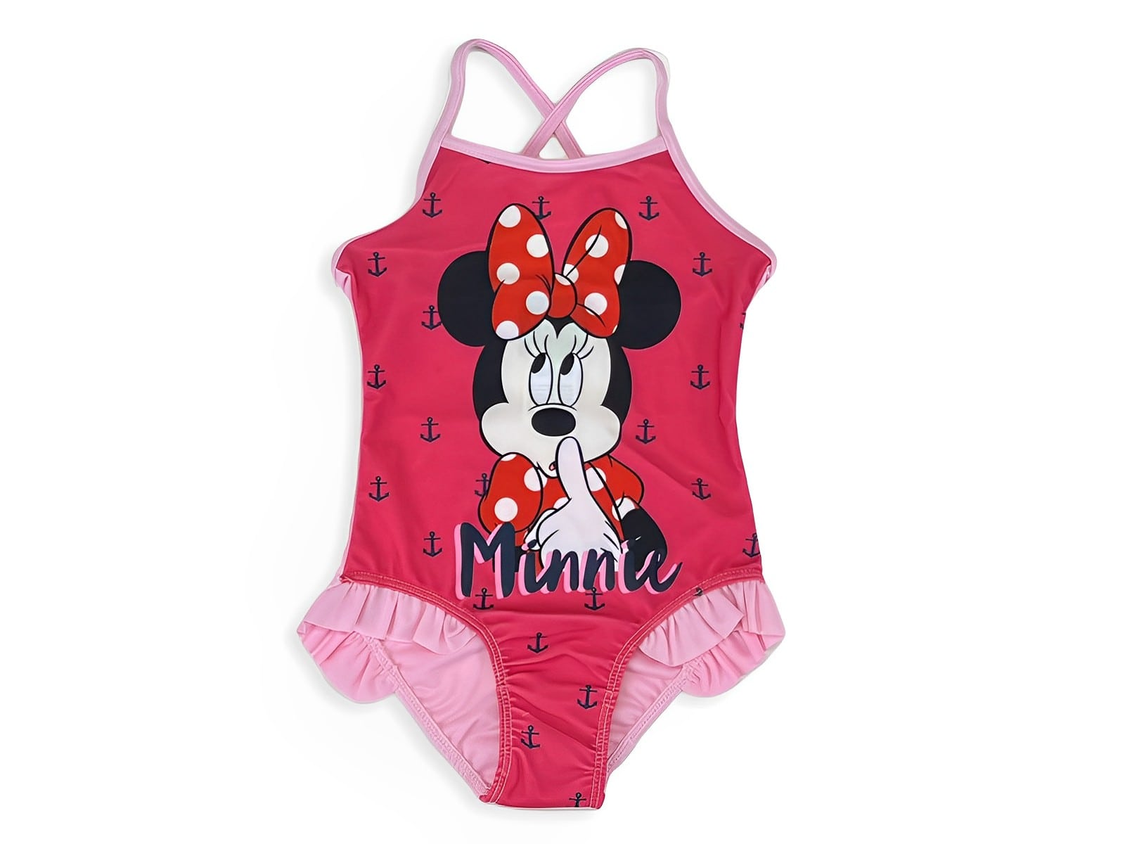 Μαγιό oλόσωμο με τιραντάκια από την εταιρία Disney με σχέδιο την φιγούρα της αγαπημένης χαρακτήρα των κινουένων σχεδίων, Μίνι Μάους (Minnie mouse). Το πίσω μέρος του είναι σε ροζ χρώμα. Είναι ιδανικό για την παραλία, την πισίνα αλλά και για το κολυμβητήριο.