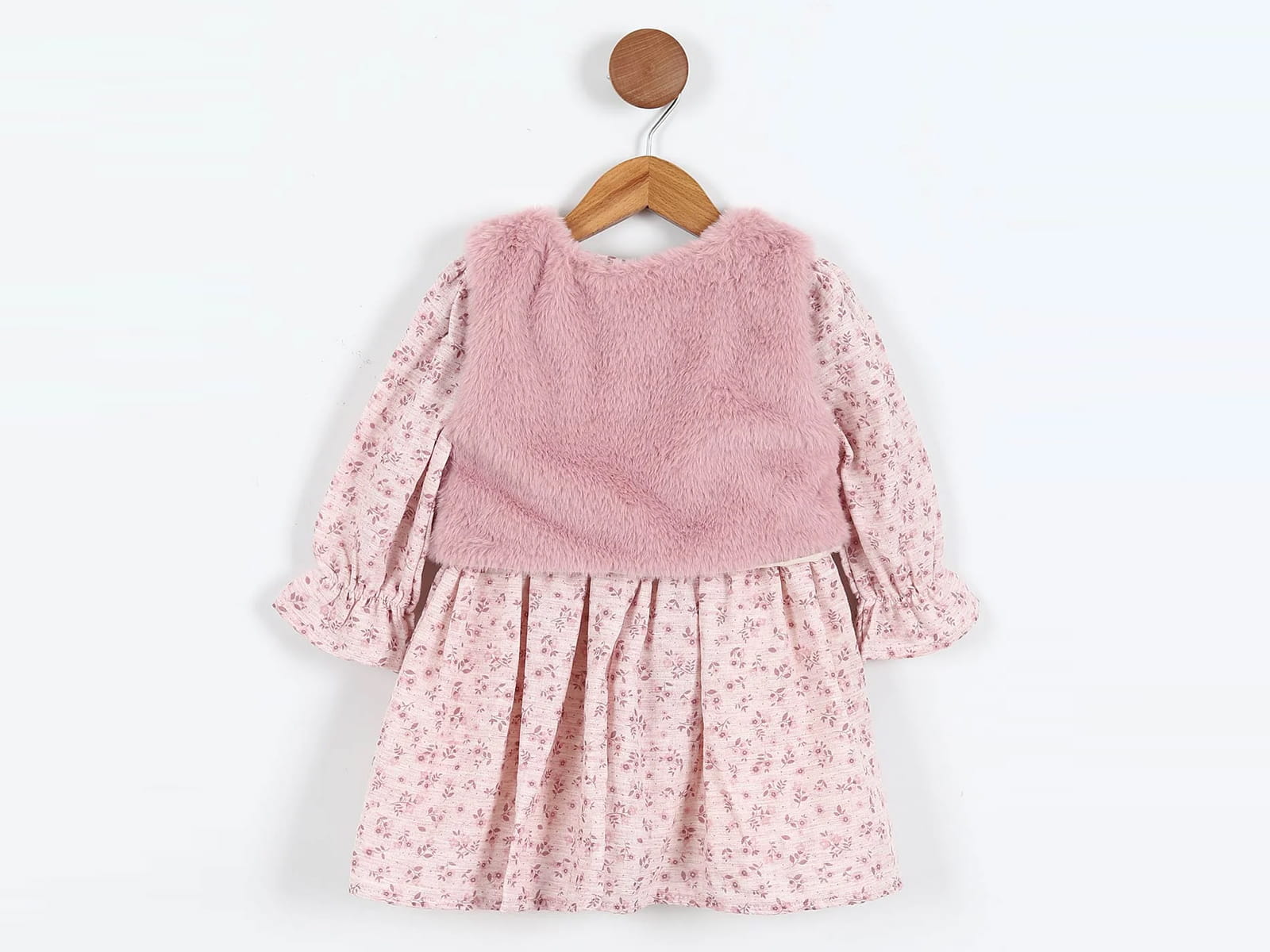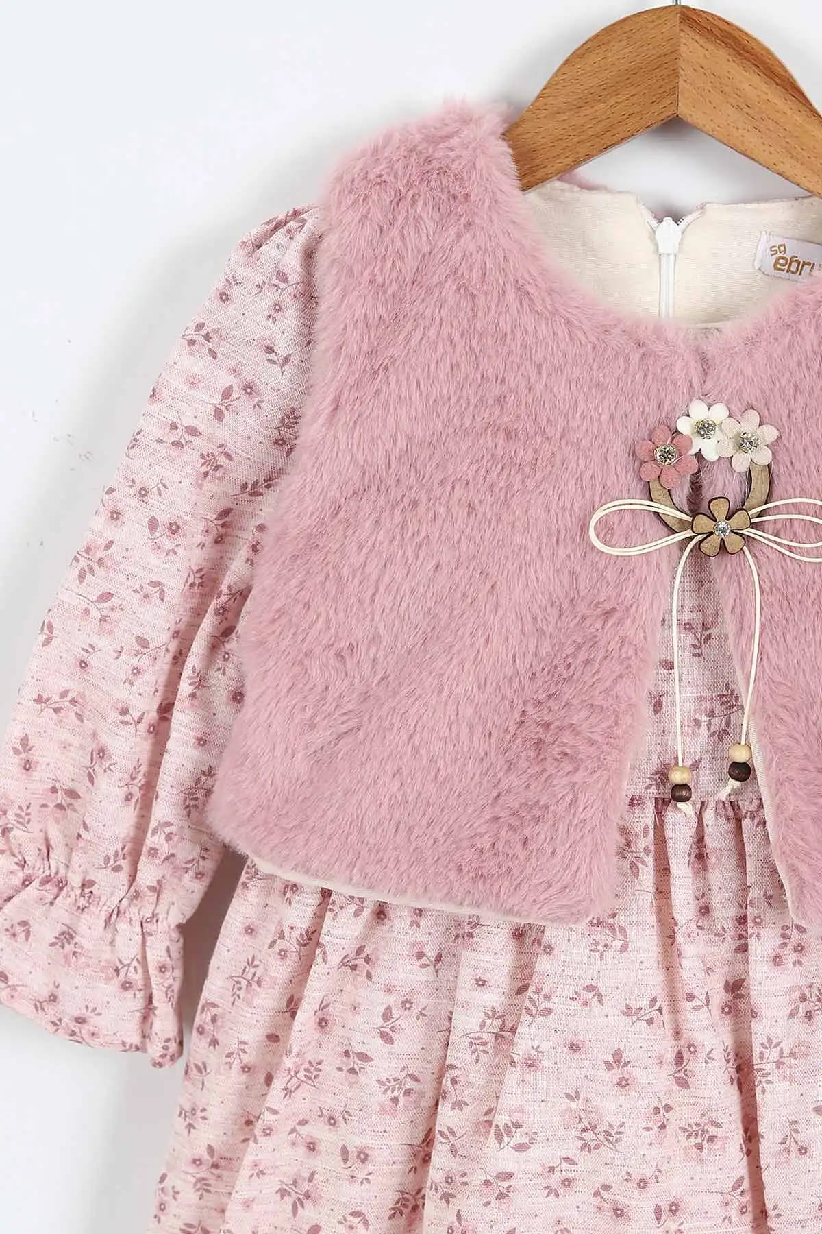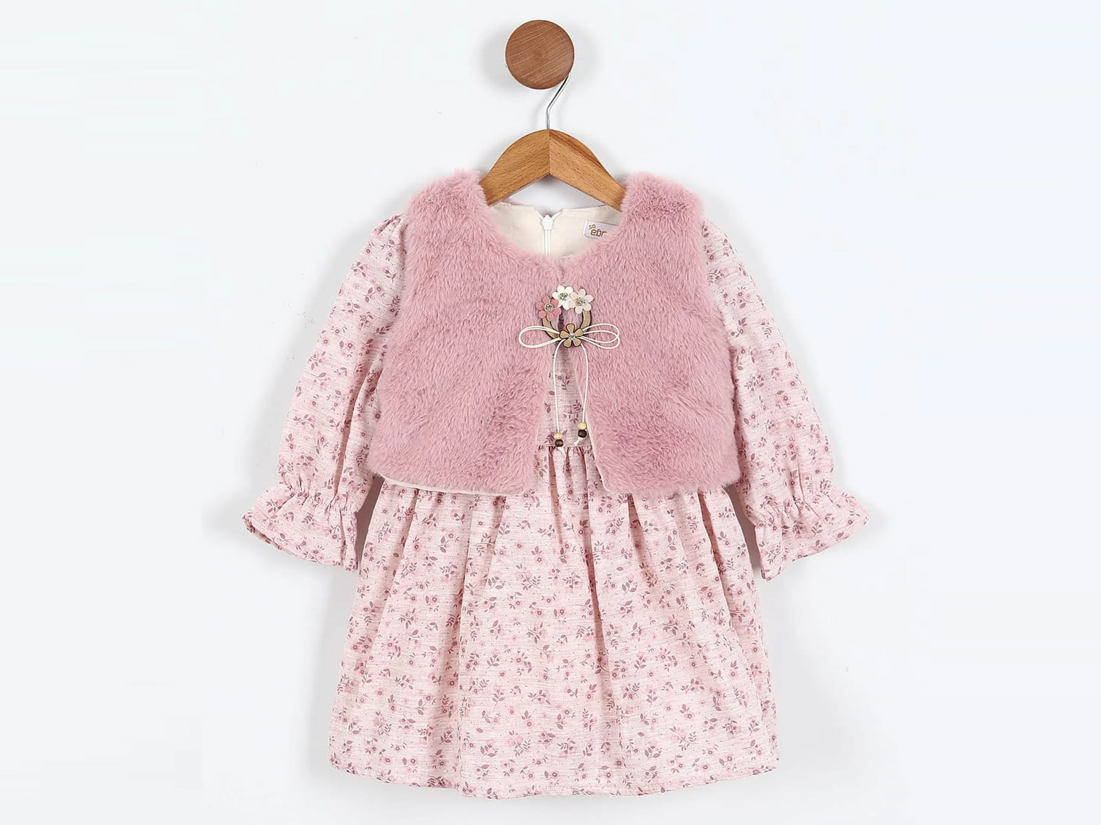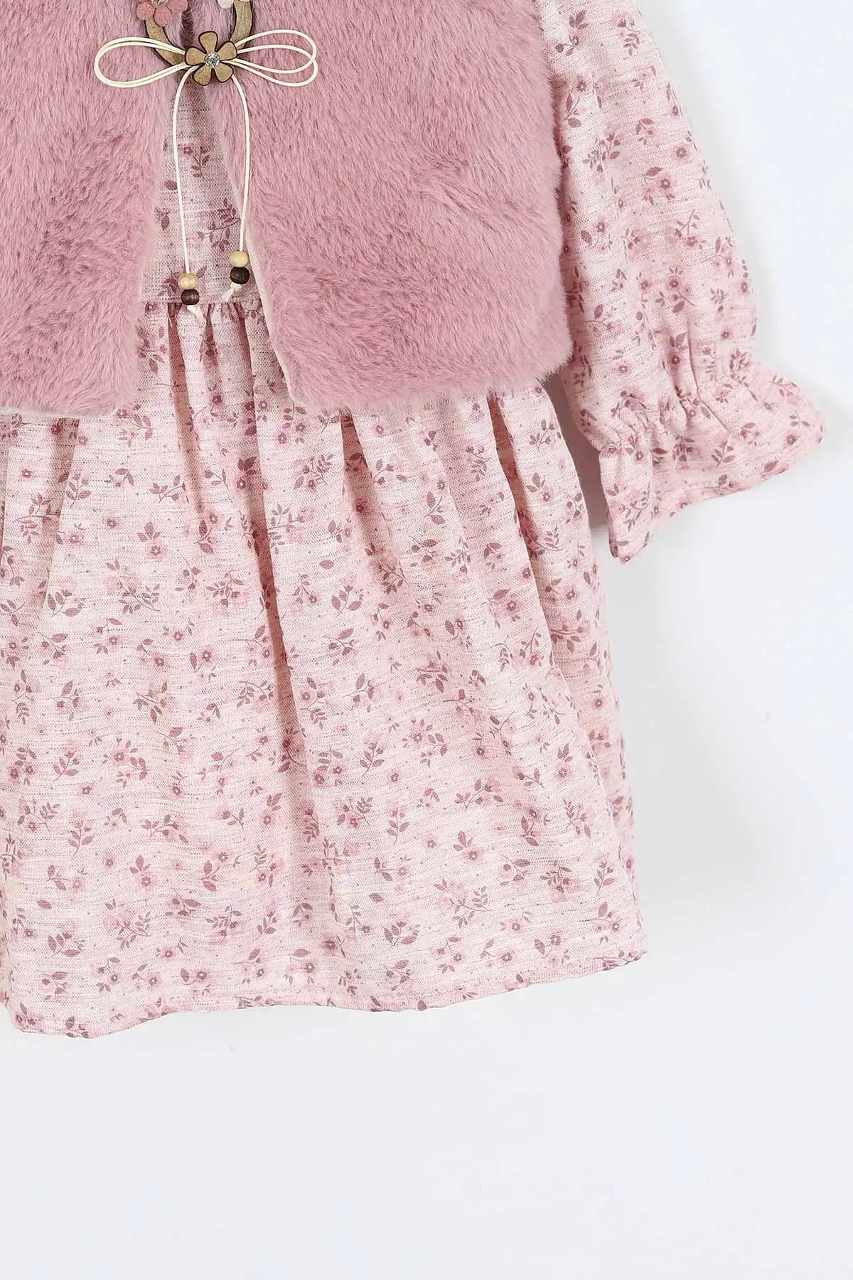 Παιδικό Φλοράλ Φόρεμα με Γούνινο Γιλέκο – Πούδρα (112389)