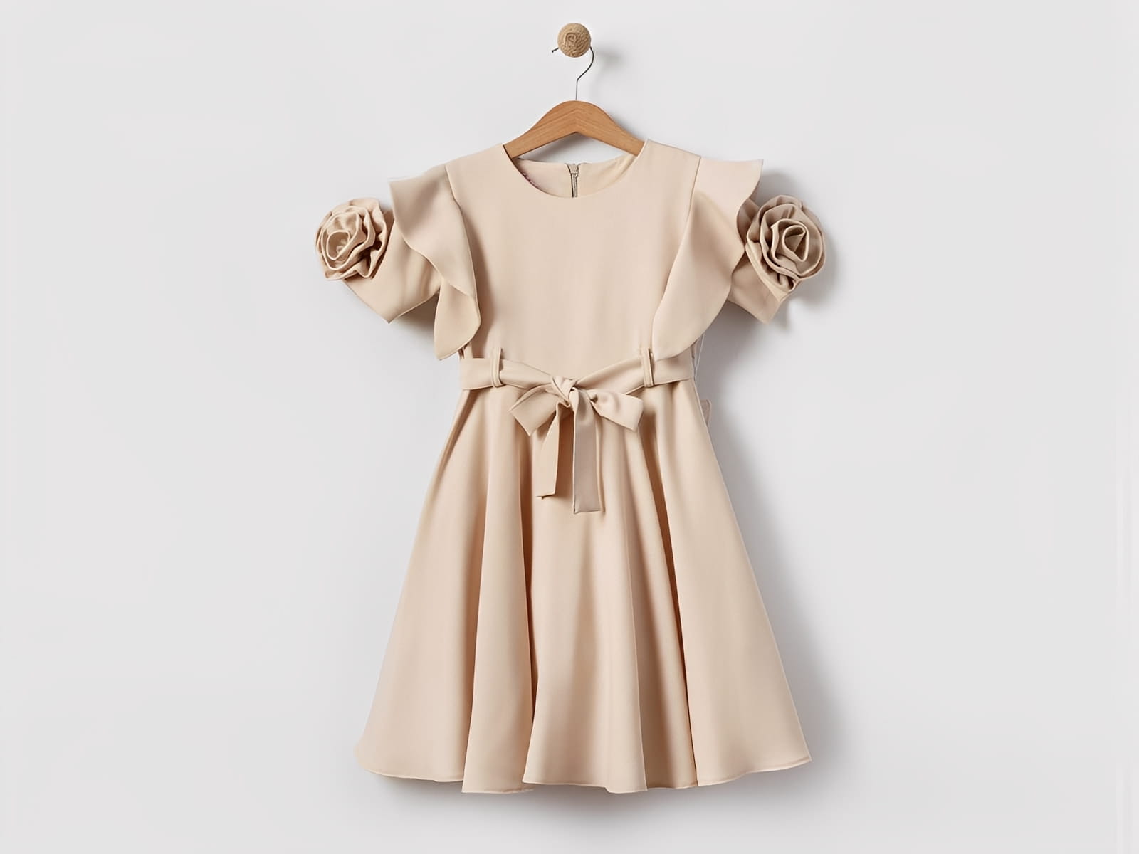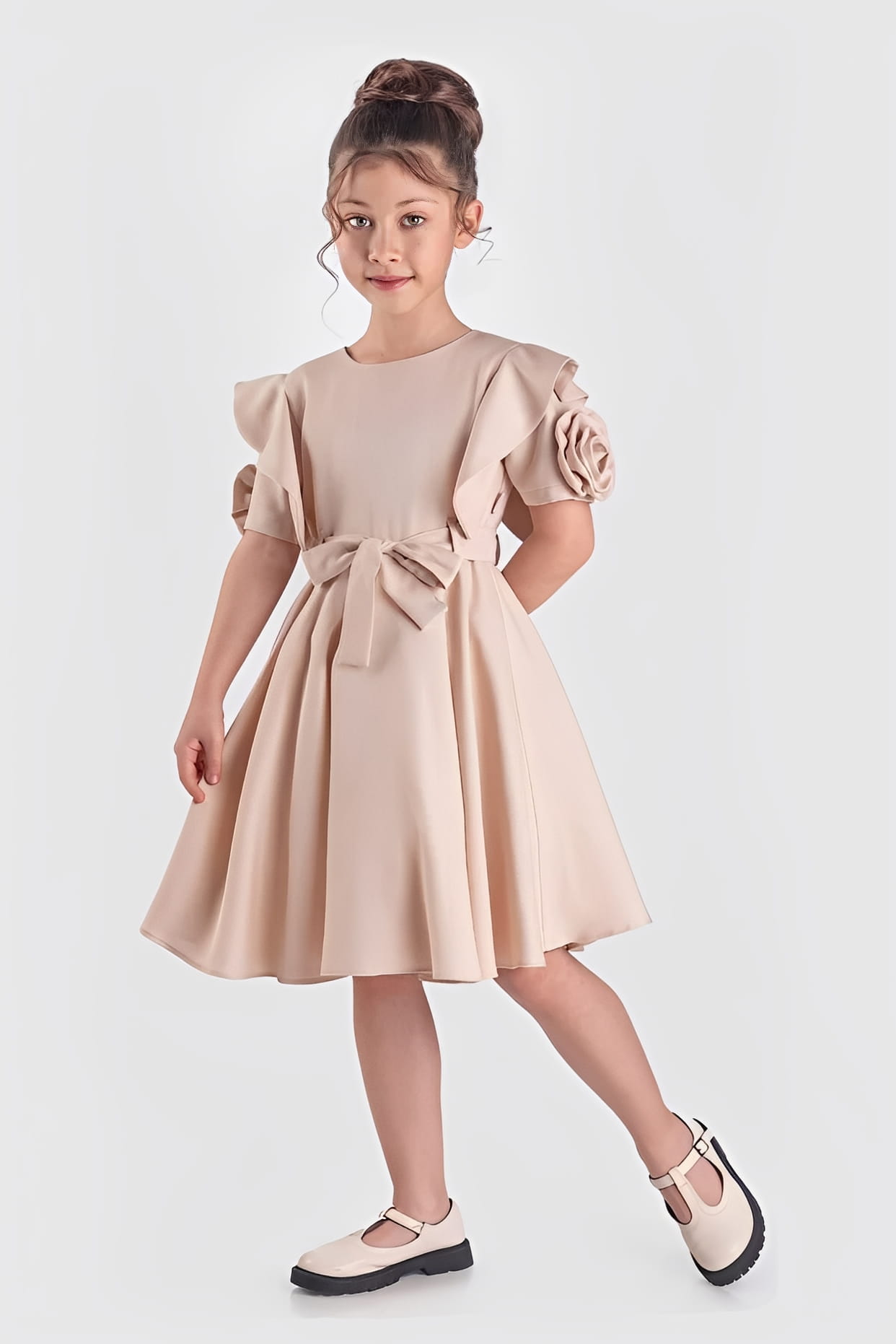 Κομψό παιδικό φόρεμα σε μπεζ χρώμα, ιδανικό για ιδιαίτερες περιστάσεις όπως βαπτίσεις, γιορτές, γενέθλια και επίσημες εμφανίσεις. Το φόρεμα διαθέτει στρογγυλή λαιμόκοψη και εντυπωσιακά κοντά μανίκια με βολάν, διακοσμημένα με υφασμάτινα λουλούδια στους ώμους, που χαρίζουν μια ξεχωριστή και ιδιαίτερα κομψή αισθητική. Η μέση τονίζεται με υφασμάτινη ζώνη που δένει σε φιόγκο. Στο πίσω μέρος διαθέτει διακριτικό φερμουάρ για εύκολη εφαρμογή. Κατασκευασμένο από ποιοτικό ύφασμα με απαλή υφή και προσεγμένο φινίρισμα, αποτελεί ιδανική επιλογή για γονείς που αναζητούν κομψότητα, ποιότητα και άνεση.
