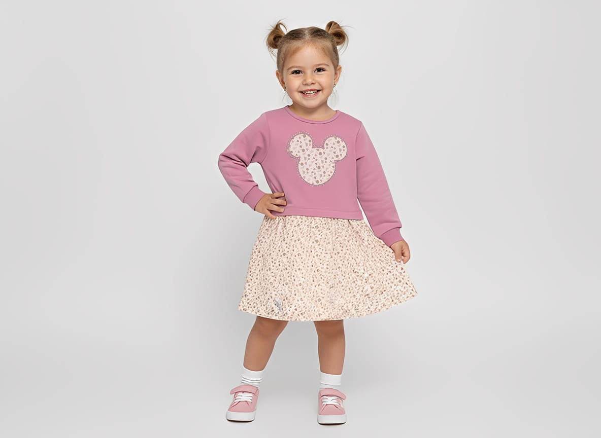 Χαριτωμένο παιδικό ενιαίο φόρεμα με ενσωματωμένο εφέ μπλούζας-φούστας, που δημιουργεί την αίσθηση σετ δύο τεμαχίων χωρίς να χάνει την άνεση του φορέματος. Το επάνω μέρος είναι σε χρώμα πούδρα με μακρύ μανίκι και διακοσμητική στάμπα με στρασάκια σε σχήμα παιδικής φιγούρας, ενώ το κάτω μέρος είναι σε λευκό χρώμα με σχέδιο λουλουδάκια. Η άνετη γραμμή του προσφέρει ελευθερία κινήσεων, ενώ το μαλακό ύφασμα χαρίζει ευχάριστη αίσθηση όλη μέρα. Κουμπώνει εύκολα στο πίσω μέρος, για γρήγορη και πρακτική εφαρμογή. Ιδανικό για καθημερινές εμφανίσεις αλλά και πιο ξεχωριστές στιγμές
