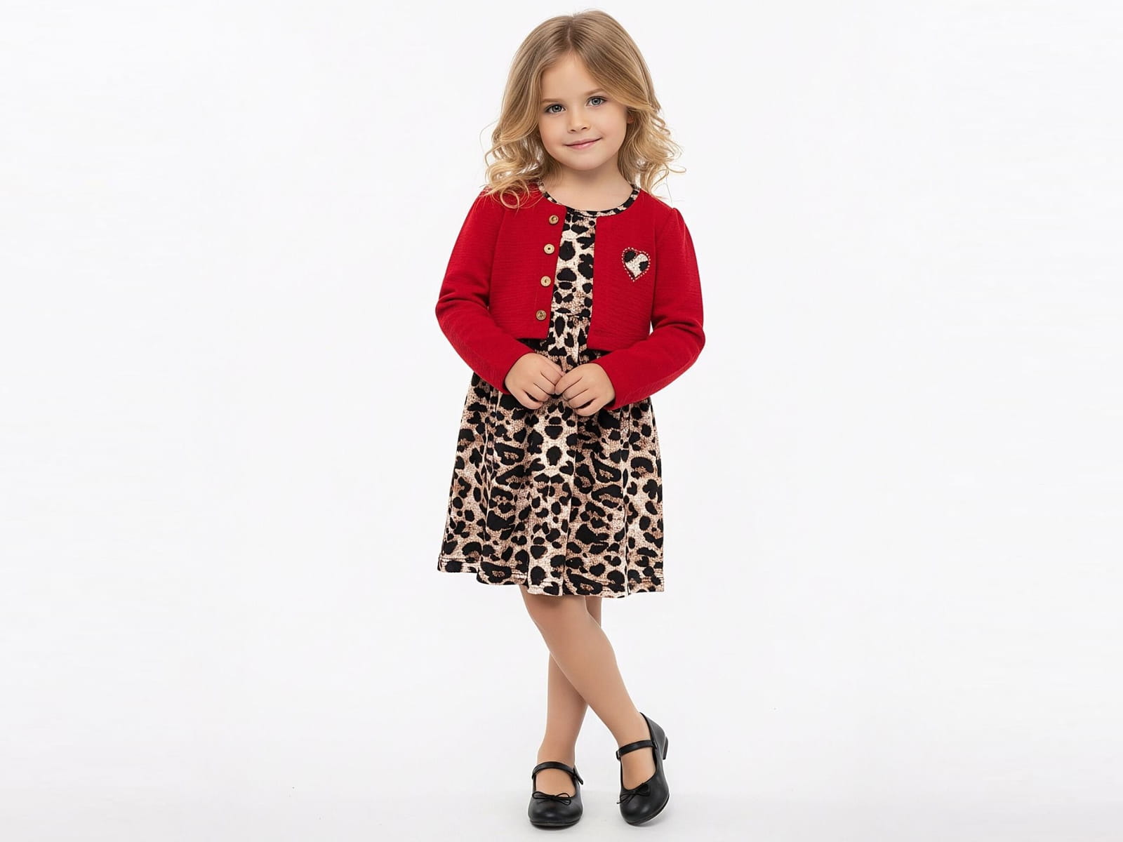 Κομψό παιδικό φόρεμα που ξεχωρίζει για τον μοντέρνο και προσεγμένο σχεδιασμό του. Το φόρεμα διαθέτει εντυπωσιακό animal print (άνιμαλ πριντ) σχέδιο, ενώ το ζακετάκι είναι εννιαίο ραμμένο στο φόρεμα σε κόκκινο χρώμα, δημιουργώντας την αίσθηση ολοκληρωμένου σετ χωρίς επιπλέον κομμάτια. Το ζακετάκι διακοσμείται με κουμπιά στο μπροστινό μέρος, καθώς και με μία στάμπα σε σχήμα καρδιάς, προσθέτοντας μια γλυκιά και παιχνιδιάρικη πινελιά. Η άνετη γραμμή του φορέματος προσφέρει ελευθερία κινήσεων και άψογη εφαρμογή, ιδανική για καθημερινή χρήση αλλά και πιο ιδιαίτερες περιστάσεις.