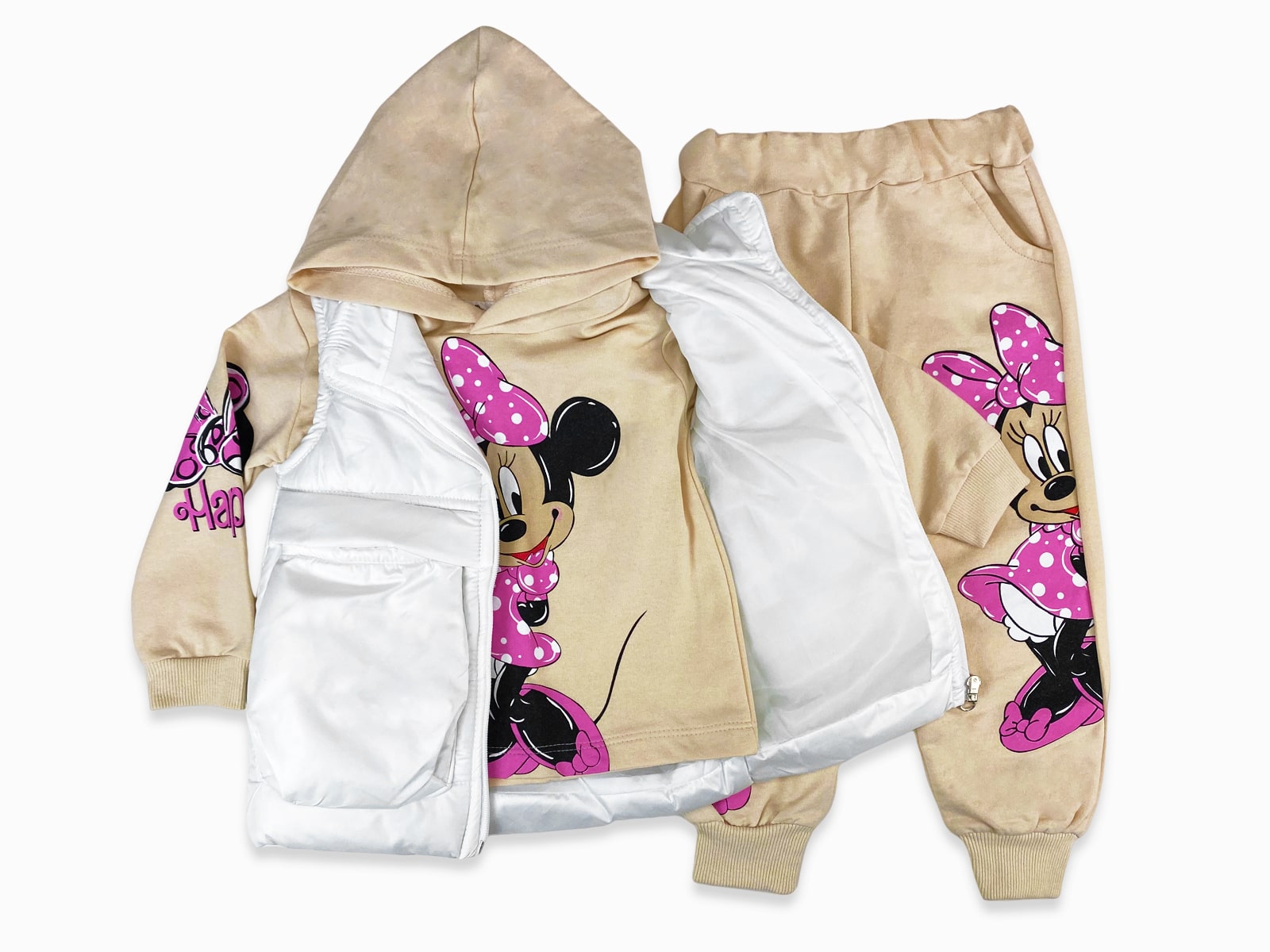 Σετ φόρμες από λεπτό φούτερ ύφασμα, το οποίο αποτελείται από παιδική μπλούζα, αμάνικο και παντελόνι. Η μπλούζα είναι σε ροζ χρώμα με κουκούλα και έχει σχέδιο στάμπα ήρωες κινουμένων σχεδίων. Το αμάνικο είναι άσπρο με 2 τσεπούλες. Το παντελόνι είναι σε ροζ χρώμα με σχέδιο φιγούρα και 2 τσέπες, ενώ έχει και λάστιχο περιμετρικά στη μέση και στο κάτω μέρος.