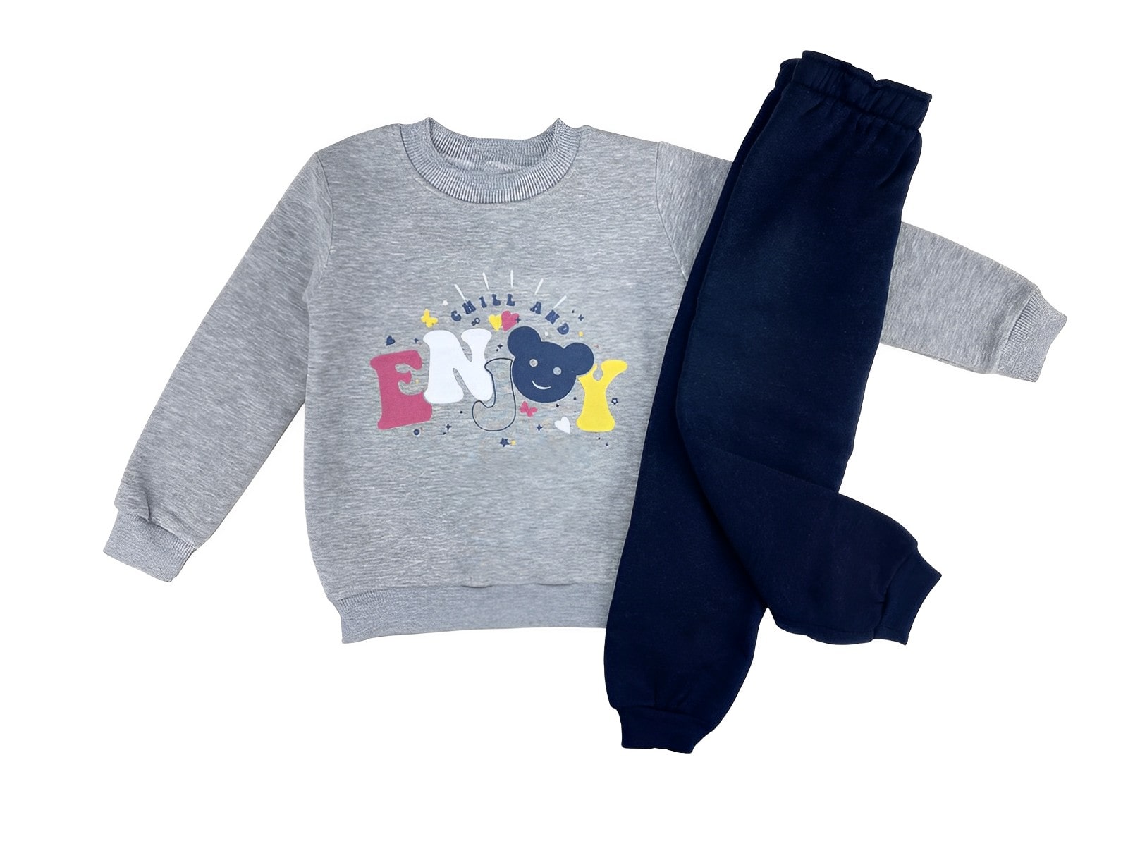 Το σετ είναι χειμερινό από χοντρό φούτερ ύφασμα με χνούδι εσωτερικά και αποτελείται από μπλούζα και παντελόνι. Η μπλουζίτσα είναι σε γκρι χρώμα και έχει σχέδιο στάμπα και γράφει “Enjoy”. Το παντελονάκι είναι σε σκούρο μπλε χρώμα και έχει λάστιχο περιμετρικά στη μέση και στο κάτω μέρος.