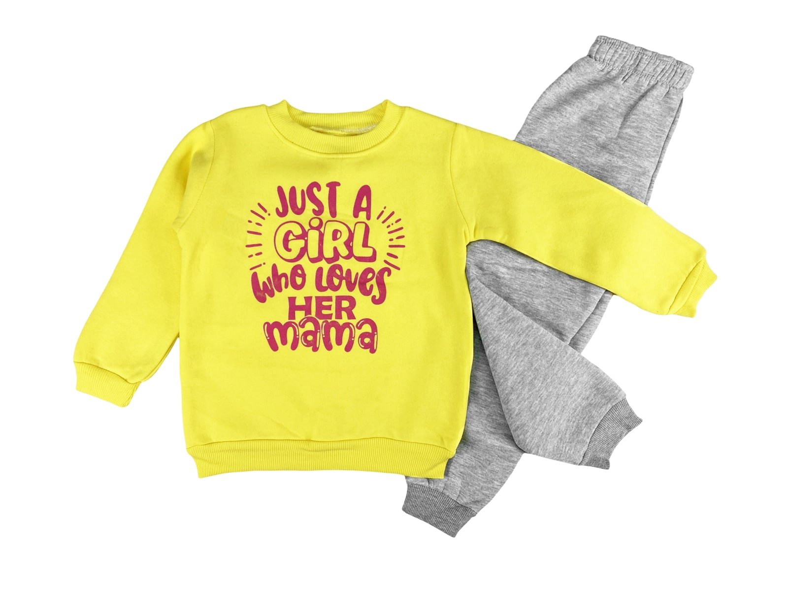 Το σετ είναι χειμερινό από χοντρό φούτερ ύφασμα με χνούδι εσωτερικά και αποτελείται από μπλούζα και παντελόνι. Η μπλουζίτσα είναι σε κίτρινο χρώμα και έχει σχέδιο στάμπα και γράφει “Just a Girl Who Loves Her Mama”. Το παντελονάκι έχει λάστιχο περιμετρικά στη μέση και στο κάτω μέρος.
