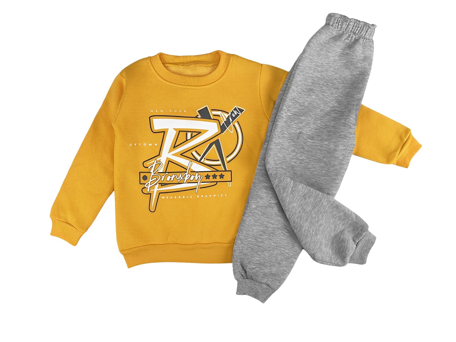 Το σετ είναι χειμερινό από χοντρό φούτερ ύφασμα με χνούδι εσωτερικά και αποτελείται από μπλούζα και παντελόνι. Η μπλουζίτσα είναι σε κίτρινο χρώμα και έχει σχέδιο στάμπα και γράφει “New York Uptown Wearable Graphics”. Το παντελονάκι έχει λάστιχο περιμετρικά στη μέση και στο κάτω μέρος.