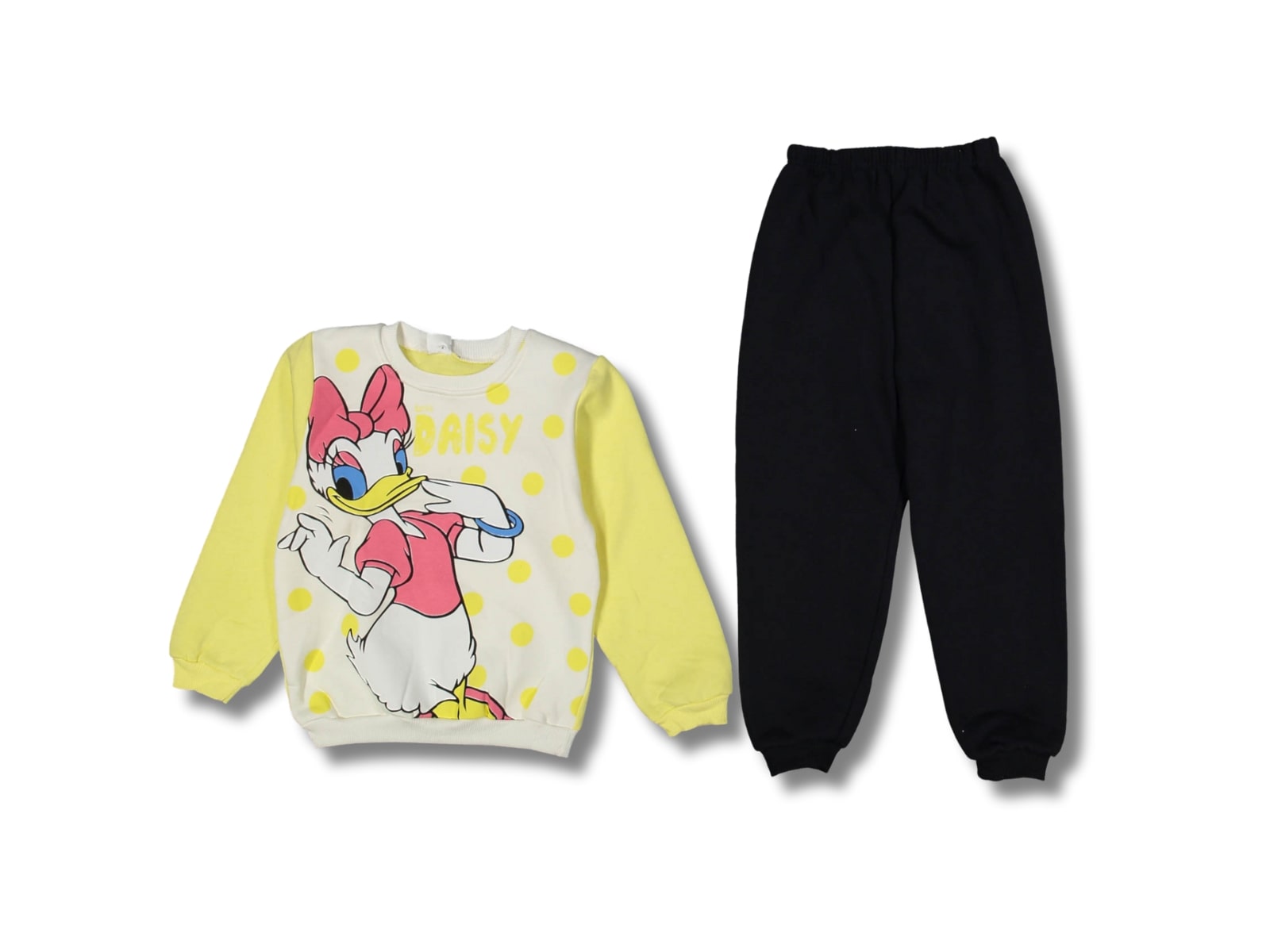 Το σετ φόρμα αποτελείται από παιδική μπλουζίτσα και παντελονάκι και είναι χειμερινό, με εσωτερική επένδυση χνούδι φλις (fleece). Η μπλούζα είναι σε άσπρο και κίτρινο χρώμα με βούλες και σχέδιο στάμπα την αγαπημένη πάπια των κοριτσιών. Το παντελόνι είναι μονόχρωμο σκούρο μπλε και έχει λάστιχο περιμετρικά στη μέση και στο κάτω μέρος.