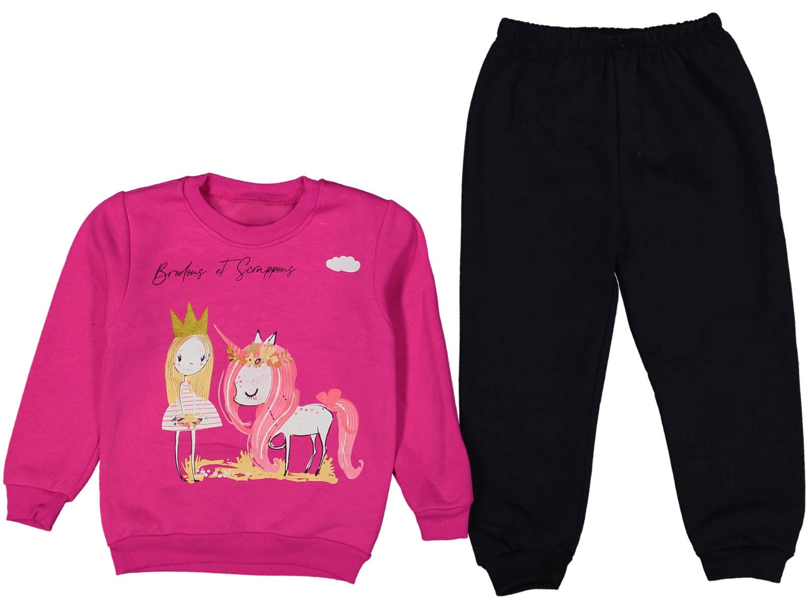Το σετ φόρμα είναι από χοντρό φούτερ ύφασμα και αποτελείται από παιδική μπλουζίτσα και παντελονάκι. Η μπλούζα είναι σε φούξια χρώμα και έχει σχέδιο στάμπα μονόκερο και κοριτσάκι με κορόνα και γράφει “Brodons et Scrappons”. Το παντελονάκι είναι σε σκούρο μπλε χρώμα και έχει λάστιχο περιμετρικά στη μέση και στο κάτω μέρος.