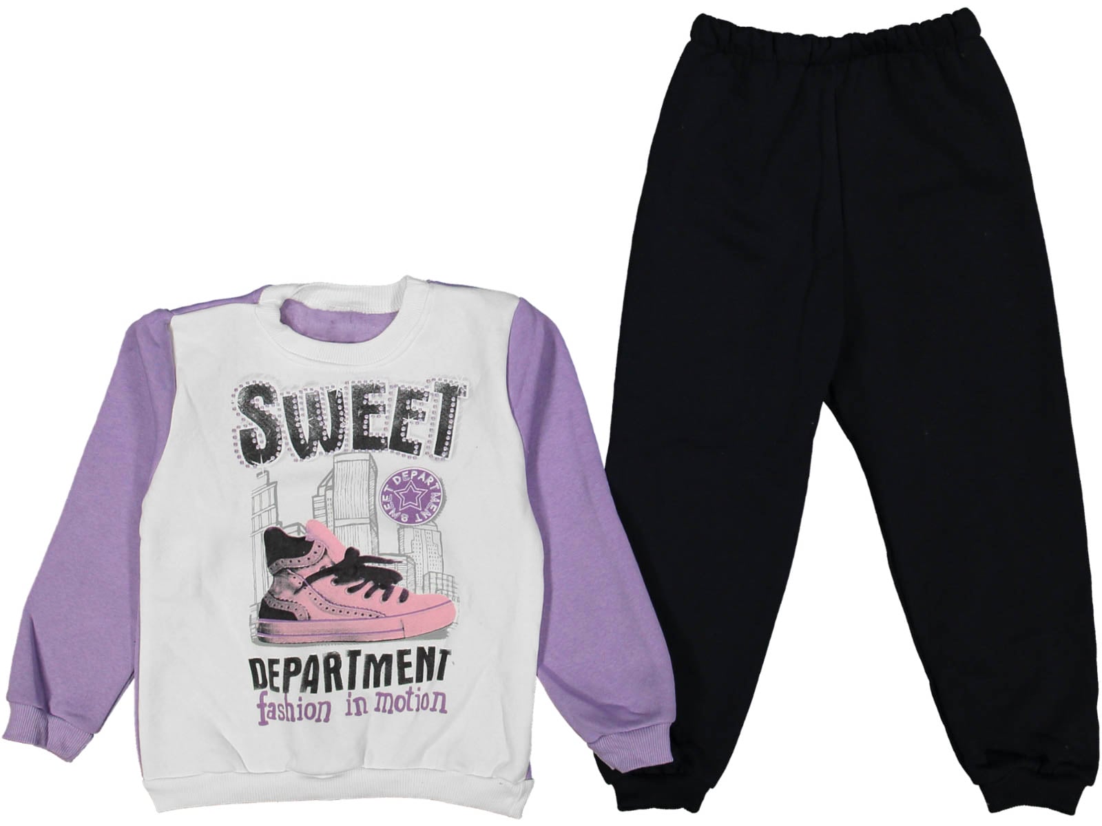 Το σετ φόρμα αποτελείται από παιδική μπλούζα και παντελόνι και είναι χειμερινό, με εσωτερική επένδυση χνούδι φλις (fleece). Η μπλούζα είναι σε άσπρο και λιλά χρώμα με σχέδιο στάμπα και γράφει “Sweet Department Fashion in Motion”. Το παντελόνι έχει λάστιχο περιμετρικά στη μέση και στο κάτω μέρος.