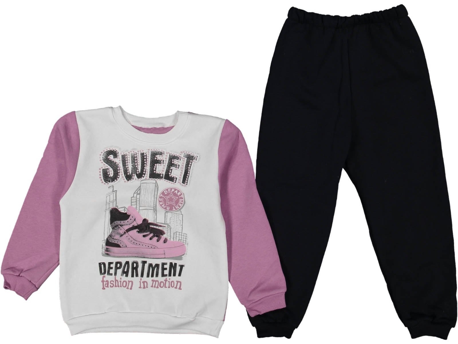 Το σετ φόρμα αποτελείται από παιδική μπλούζα και παντελόνι και είναι χειμερινό, με εσωτερική επένδυση χνούδι φλις (fleece). Η μπλούζα είναι σε άσπρο χρώμα και πούδρα με σχέδιο στάμπα και γράφει “Sweet Department Fashion in Motion”. Το παντελόνι έχει λάστιχο περιμετρικά στη μέση και στο κάτω μέρος.