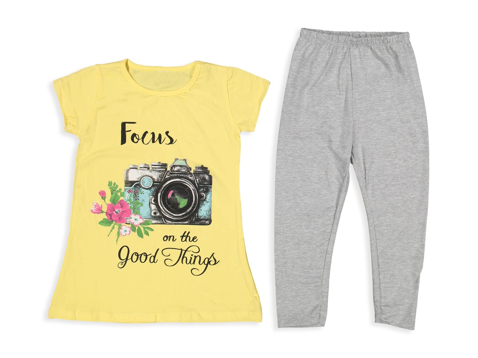 Το σετ αυτό αποτελείται από μία κοντομάνικη μπλούζα και ένα παντελόνι. Η μπλουζίτσα είναι σε κίτρινο χρώμα με σχέδιο φωτογραφική μηχανή και γράφει “Focus On The Good Things”. Το παντελονάκι είναι γκρι μονόχρωμο, και έχει λάστιχο περιμετρικά στη μέση.