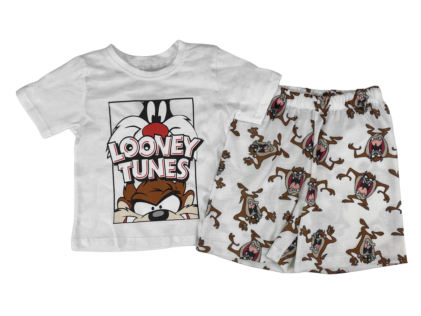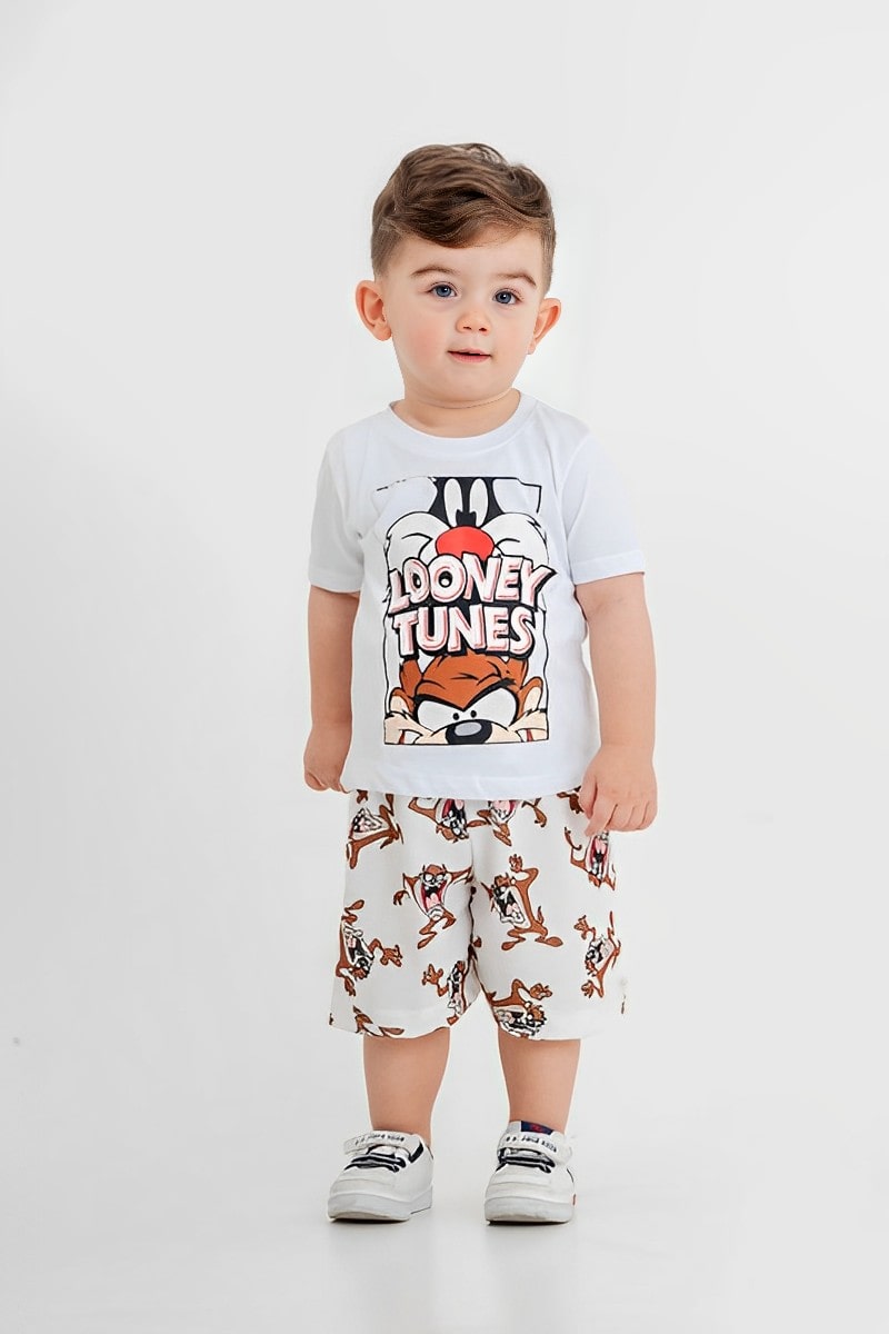 Το σετ αυτό αποτελείται από μία κοντομάνικη μπλουζίτσα και ένα παντελονάκι. Η μπλουζίτσα είναι σε άσπρο χρώμα με στάμπα ήρωες αγαπημένων σχεδίων. Η βερμούδα έχει λάστιχο περιμετρικά στη μέση.