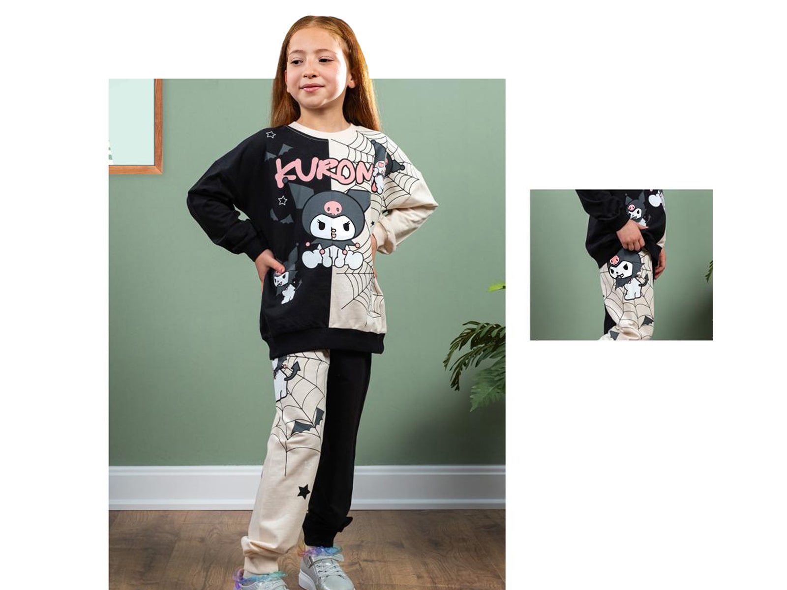 Σετ φόρμες από λεπτό μακό ύφασμα, το οποίο αποτελείται από παιδική μπλουζίτσα και παντελονάκι. Η μπλούζα είναι σε διχρωμία με τη μισή να είναι σε μαύρο χρώμα και την άλλη μισή σε μπεζ χρώμα, με στρογγυλή λαιμόκοψη με σχέδιο στάμπα αγαπημένη ηρωίδα κινούμενων σχεδιών των κοριτσιών. Το παντελόνι είναι και αυτό σε διχρωμία με το ένα μπατζάκι να είναι σε μαύρο χρώμα και το άλλο σε μπεζ χρώμα με κορδονάκι και σχέδιο στάμπα, ενώ έχει και λάστιχο περιμετρικά στη μέση και στο κάτω μέρος για τέλεια εφαρμογή.