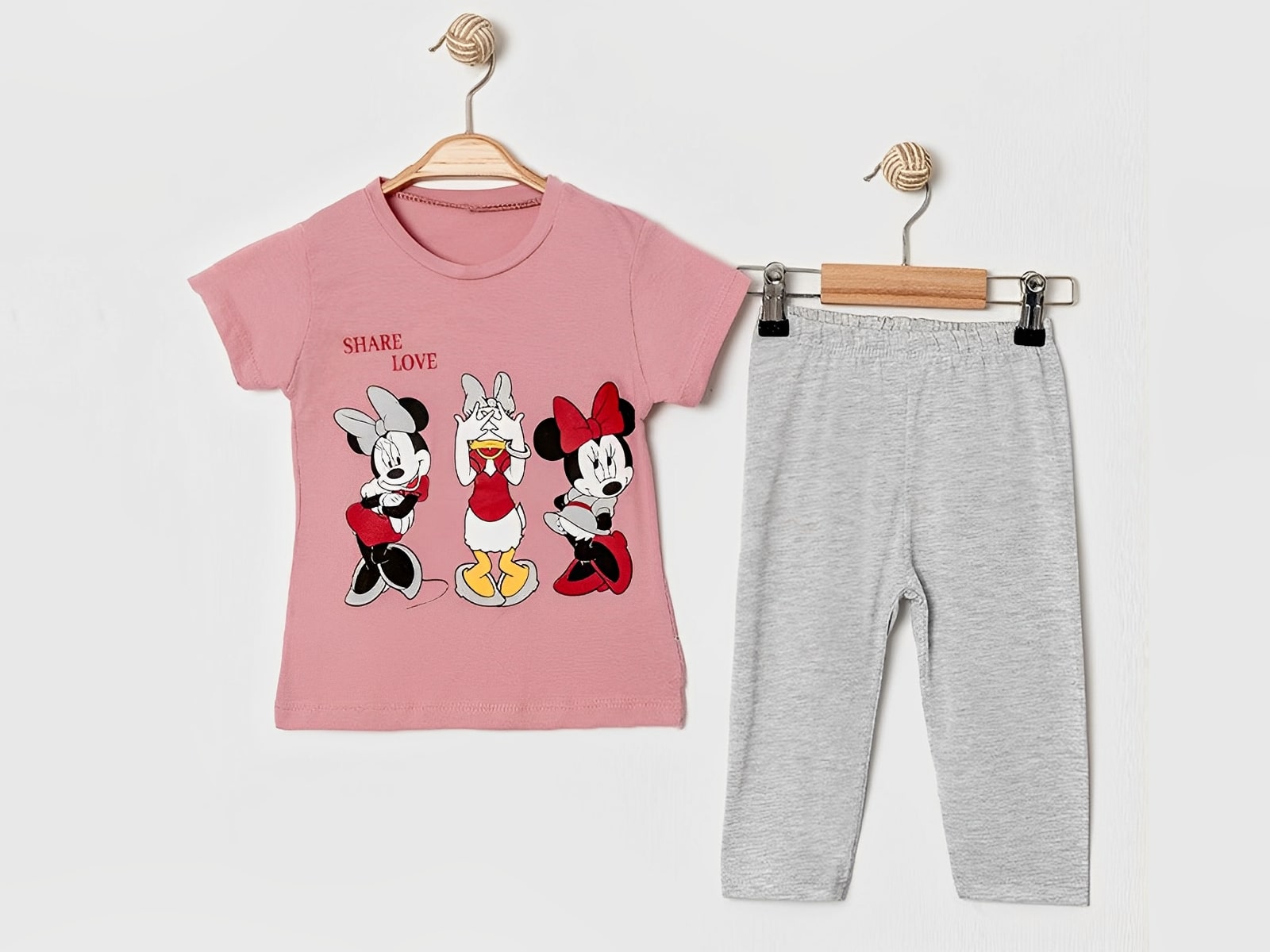 Το σετ αποτελείται από μία κοντομάνικη μπλουζίτσα και ένα παντελόνι κάπρι. Η μπλούζα είναι σε χρώμα πούδρας με σχέδιο στάμπα ηρωήδες κινουμένων σχεδίων. Το παντελονάκι είναι κάπρι σε γκρι χρώμα και έχει λάστιχο περιμετρικά στη μέση.