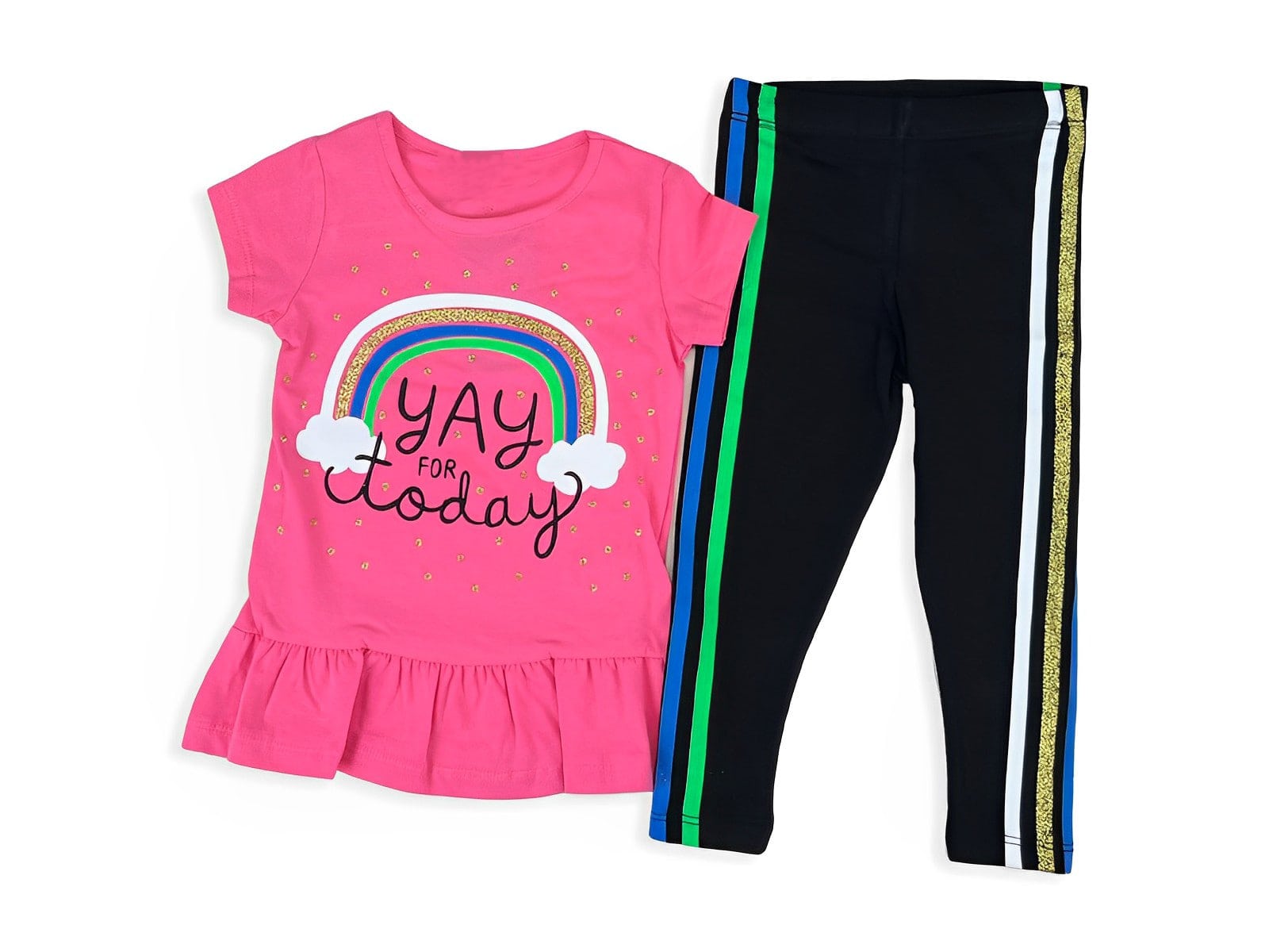 Το σετ αποτελείται από μία κοντομάνικη μπλουζίτσα και ένα παντελόνι κολάν τα οποία έχουν στρασάκια. Η μπλούζα είναι σε ροζ χρώμα με βολάν στο κάτω μέρος της, έχει σχέδιο ουράνιο τόξο και γράφει “Yay For Today”. Το παντελονάκι είναι κολάν σε μαύρο χρώμα και έχει λάστιχο περιμετρικά στη μέση. Και η μπλούζα και το παντελόνι είναι διακοσμημένα με στρασάκια.