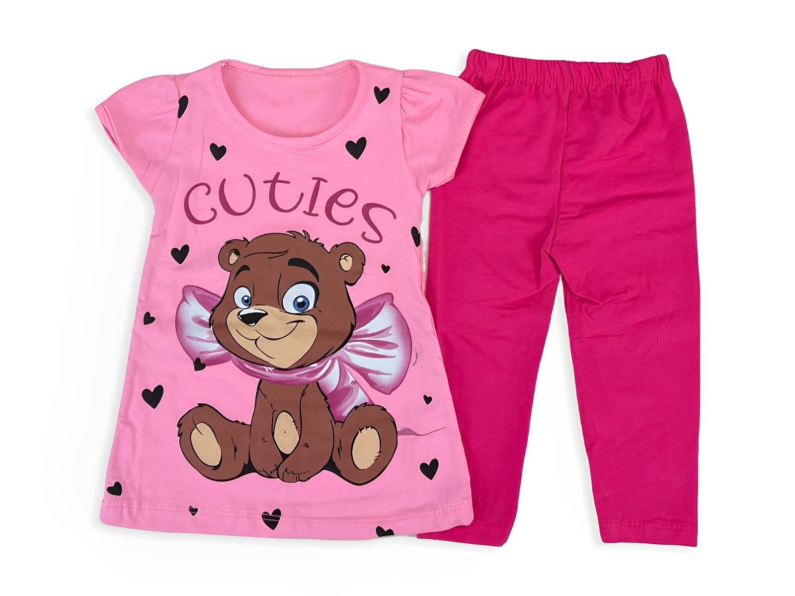Το σετ αποτελείται από μία κοντομάνικη μπλουζίτσα και ένα παντελονάκι κολάν κάπρι. Η μπλούζα είναι σε ροζ χρώμα με σχέδιο στάμπα αρκουδάκι και γράφει “Cuties”. Το κολάν είναι κάπρι σε φουξ χρώμα και έχει λάστιχο περιμετρικά στη μέση.