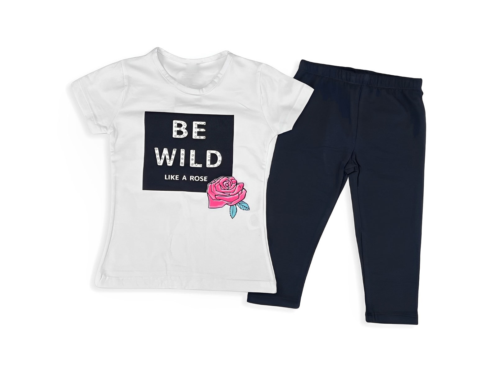 Το σετ αποτελείται από μία κοντομάνικη μπλουζίτσα και ένα παντελονάκι κολάν κάπρι. Η μπλούζα είναι σε άσπρο χρώμα με σχέδιο λουλουδάκι και γράφει “Be Wild Like A Rose”. Είναι διακοσμημένη με στρασάκια. Το παντελόνι είναι κολάν κάπρι σε σκούρο μπλε χρώμα και έχει λάστιχο περιμετρικά στη μέση.