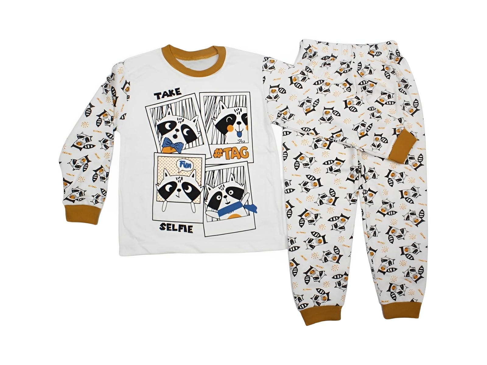 Το σετ αυτό αποτελείται από μπλούζα και παντελόνι. Η μπλουζίτσα είναι σε άσπρο – κεραμιδί χρώμα και έχει σχέδιο ζωάκια ρακούν. Το παντελονάκι είναι στο ίδιο σχέδιο με την μπλούζα και έχει λάστιχο περιμετρικά στη μέση και στους αστραγάλους για καλύτερη εφαρμογή.