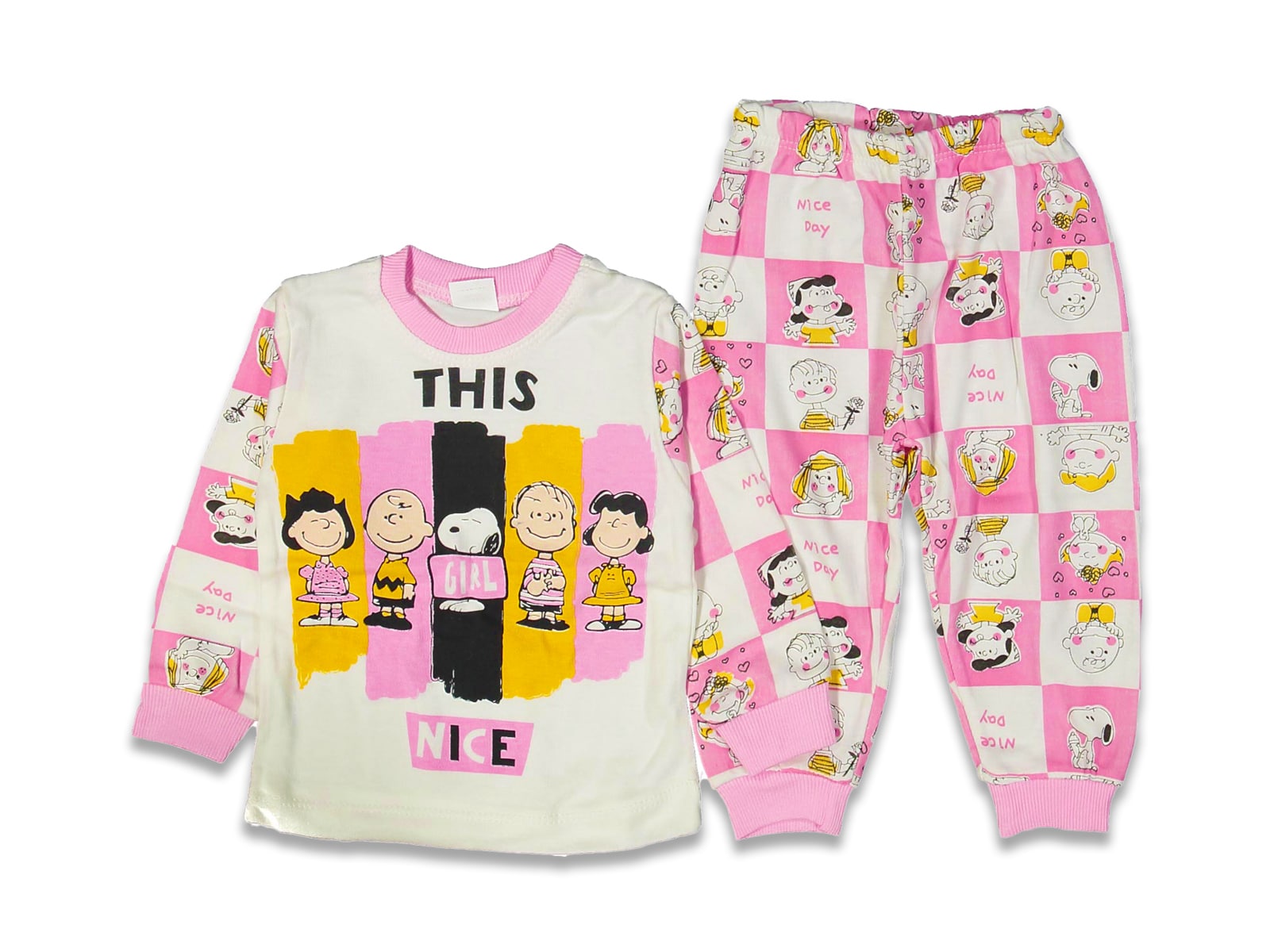 Το σετ αυτό αποτελείται από μπλουζίτσα και παντελονάκι. Η μπλουζίτσα είναι σε ροζ χρώμα και έχει ήρωα κινουμένων σχεδίων . Το παντελονάκι έχει καρό σχέδιο με ήρωες κινουμένων σχεδίων, γράφει “Nice Day” και έχει λάστιχο περιμετρικά στη μέση και στο κάτω μέρος.